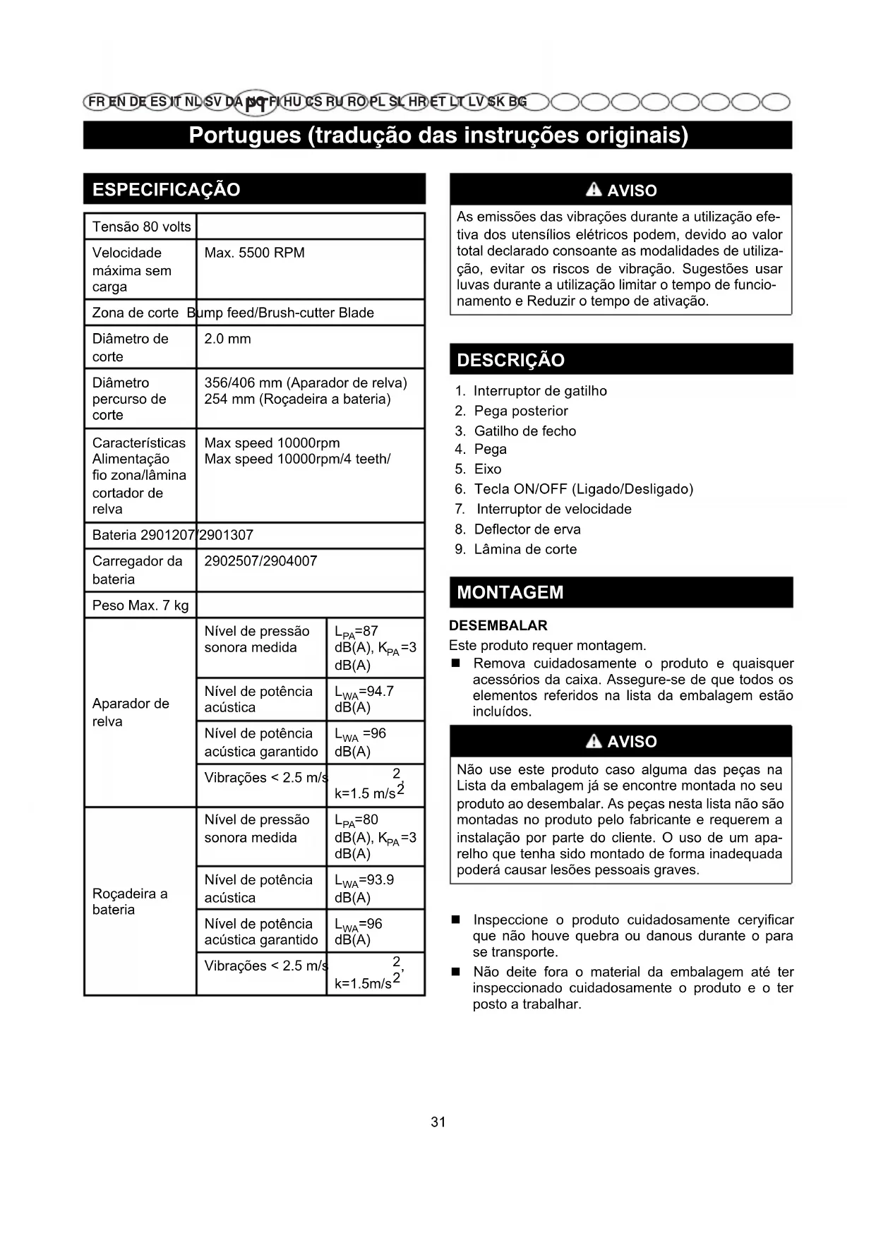 ESPECIFICAÇÃO Tensão 80 volts Velocidade máxima sem carga Max. 5500 RPM Zona de corte Bump feed/Brush-cutter Blade Diâmetro de corte