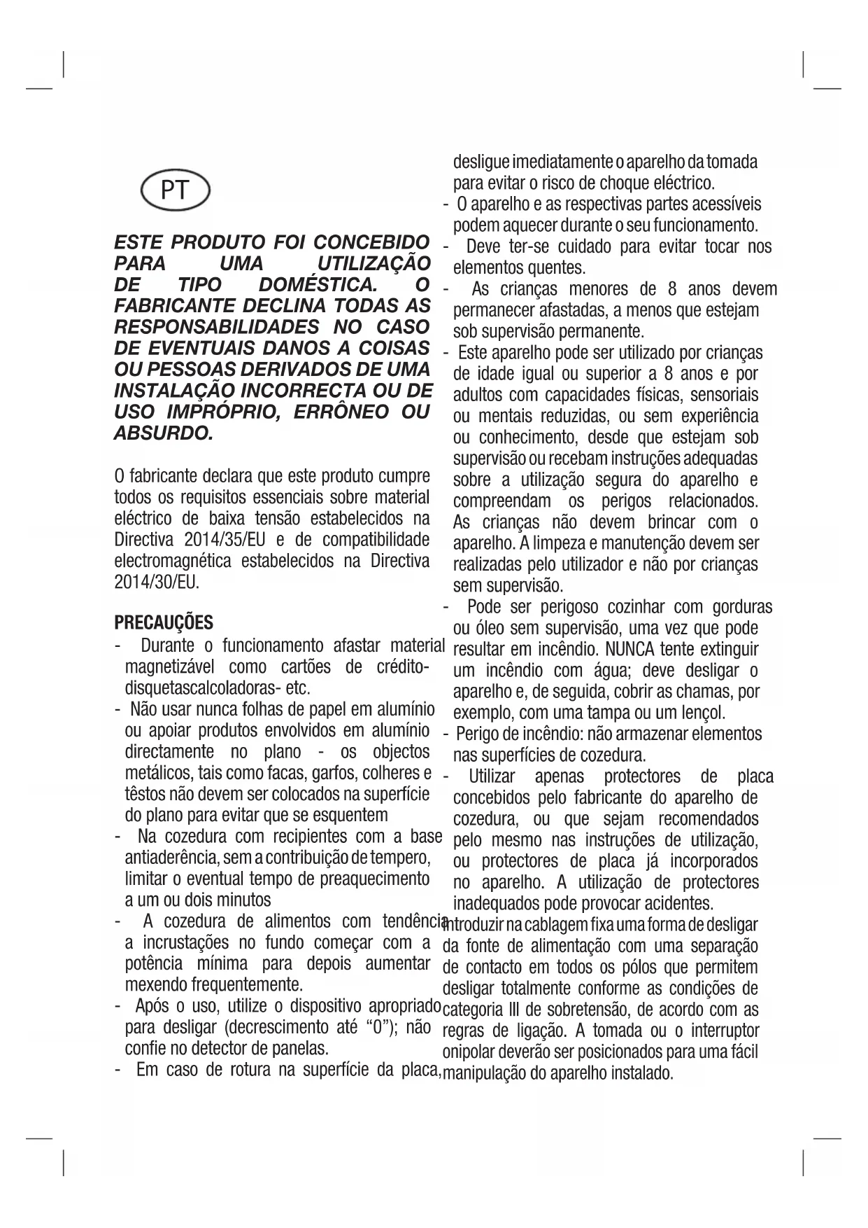 ABSURDO. O fabricante declara que este produto cumpre todos os requisitos essenciais sobre material eléctrico de baixa tensão estabelecidos na Directiva 2014/35/EU e de compatibilidade electromagnética estabelecidos na Directiva 2014/30/EU. PRECAUÇÕES - Durante o funcionamento afastar material magnetizável como cartões de crédito- disquetascalcoladoras- etc. - Não usar nunca folhas de papel em alumínio ou apoiar produtos envolvidos em alumínio directamente no plano - os objectos metálicos, tais como facas, garfos, colheres e têstos não devem ser colocados na superfície do plano para evitar que se esquentem - Na cozedura com recipientes com a base antiaderência, sem a contribuição de tempero, limitar o eventual tempo de preaquecimento a um ou dois minutos - A cozedura de alimentos com tendência a incrustações no fundo começar com a potência mínima para depois aumentar mexendo frequentemente. - Após o uso, utilize o dispositivo apropriado para desligar (decrescimento até “0”); não confie no detector de panelas. - Em caso de rotura na superfície da placa, desligue imediatamente o aparelho da tomada para evitar o risco de choque eléctrico. - O aparelho e as respectivas partes acessíveis podem aquecer durante o seu funcionamento. - Deve ter-se cuidado para evitar tocar nos elementos quentes. - As crianças menores de 8 anos devem permanecer afastadas, a menos que estejam sob supervisão permanente. - Este aparelho pode ser utilizado por crianças de idade igual ou superior a 8 anos e por adultos com capacidades físicas, sensoriais ou mentais reduzidas, ou sem experiência ou conhecimento, desde que estejam sob supervisão ou recebam instruções adequadas sobre a utilização segura do aparelho e compreendam os perigos relacionados. As crianças não devem brincar com o aparelho. A limpeza e manutenção devem ser realizadas pelo utilizador e não por crianças sem supervisão. - Pode ser perigoso cozinhar com gorduras ou óleo sem supervisão, uma vez que pode resultar em incêndio. NUNCA tente extinguir um incêndio com água; deve desligar o aparelho e, de seguida, cobrir as chamas, por exemplo, com uma tampa ou um lençol. - Perigo de incêndio: não armazenar elementos nas superfícies de cozedura. - Utilizar apenas protectores de placa concebidos pelo fabricante do aparelho de cozedura, ou que sejam recomendados pelo mesmo nas instruções de utilização, ou protectores de placa já incorporados no aparelho. A utilização de protectores inadequados pode provocar acidentes. Introduzir na cablagem fixa uma forma de desligar da fonte de alimentação com uma separação de contacto em todos os pólos que permitem desligar totalmente conforme as condições de categoria III de sobretensão, de acordo com as regras de ligação. A tomada ou o interruptor onipolar deverão ser posicionados para uma fácil manipulação do aparelho instalado. PTEste aparelho não está preparado para poder funcionar por meio de um temporizador externo ou sistema de controlo remoto separado. O construtor declina qualquer responsabilidade no caso que não tenham sido respeitadas to- das as disposições aqui em cima, assim como as normas para a prevenção de acidentes. Se o cabo de alimentação estiver danicado, deve ser substituído pelo fabricante ou pelo serviço de assistência técnica ou, em todo o caso, por uma pessoa qualicada, de modo a prevenir qualquer perigo. PRINCÍPIO DE FUNCIONAMENTO (Fig. 1) É baseado nas propriedades electromagnéticas da maior parte dos recipientes para a cozedura. O circuito electrónico administra o funcionamento da bobina (indutor) que cria um campo magnético. O calor é transmitido pelo próprio recipiente ao alimento. A cozedura acontece com descrito abaixo. - mínima dispersão (alto rendimento) - o retiro da panela (basta só a elevação) provoca automaticamente a paragem do sistema - o sistema electrónico permite a máxima flexibilidade e delicadeza de regulação. (Fig. 1) 1 Recipiente 2 Corrente induzida 3 Campo magnético 4 Indutor 5 Circuito electrónico 6 Alimentação eléctrica Instruções para o utilizador (Fig. 2) 1 Ligar/Desligar ON/OFF 2 Aumentar – 3 Diminuir + 4 Indicador de zona de cozedura 5 Visor de nível de potência 6 Luz indicadora de zona temporizada