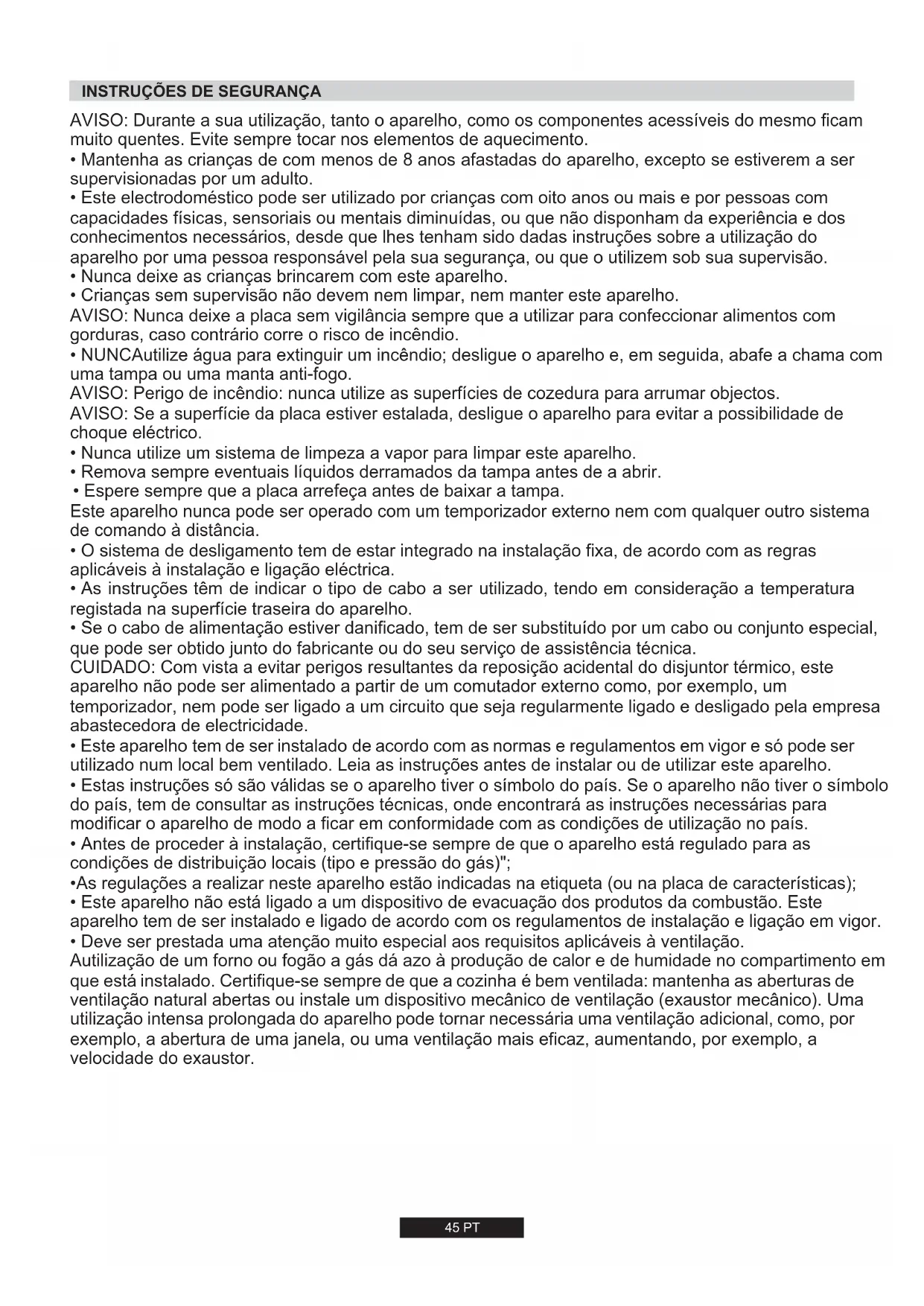 - Crianças sem supervisão não devem nem limpar, nem manter este aparelho. AVISO: Nunca deixe a placa sem vigilância sempre que a utilizar para confeccionar alimentos com gorduras, caso contrário corre o risco de incêndio.