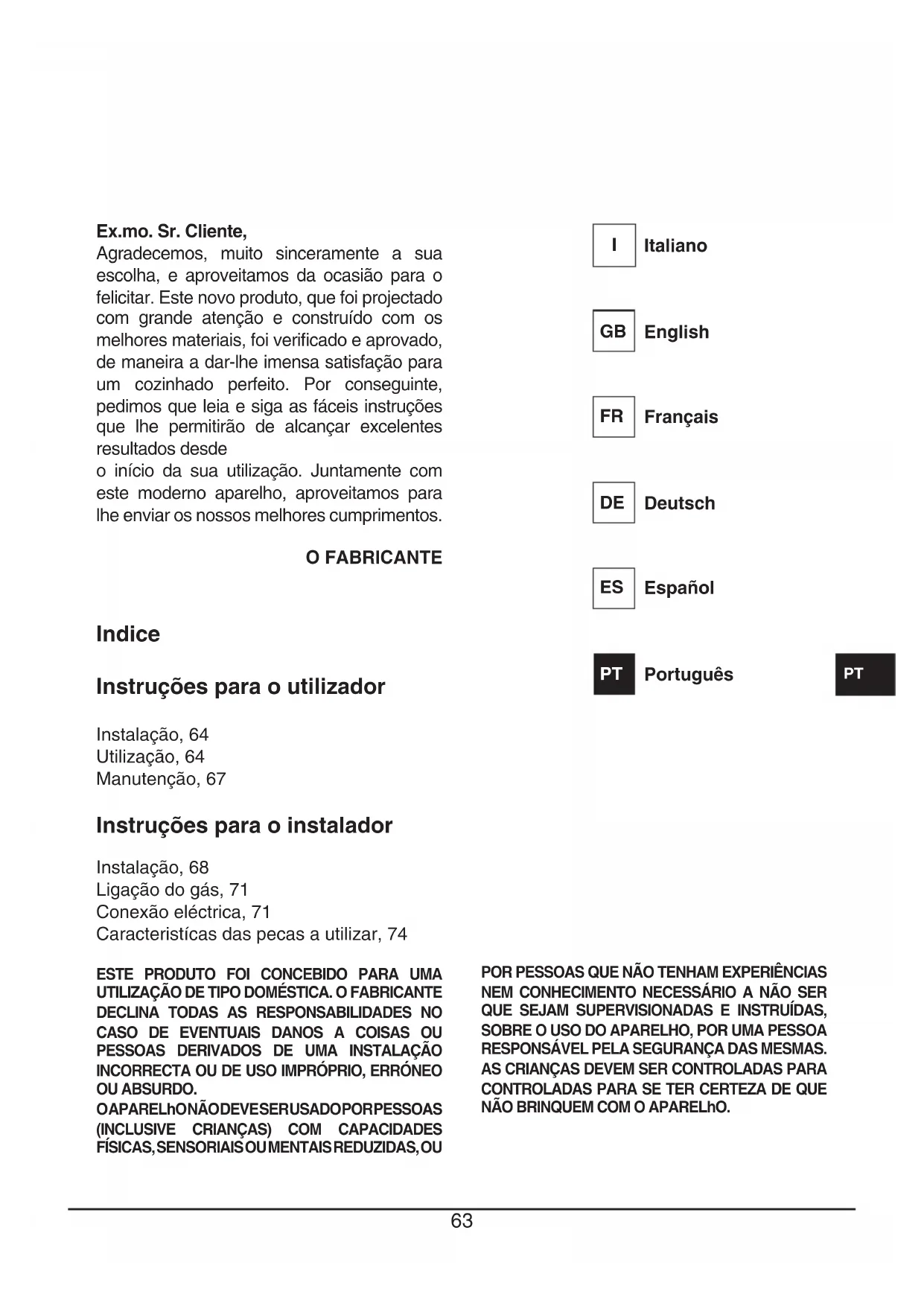 ESTE PRODUTO FOI CONCEBIDO PARA UMA UTILIZACAO DE TIPO DOMESTICA. O FABRICANTE DECLINA TODAS AS RESPONSABILIDADES NO CASO DE EVENTUAIS DANOS A COISAS OU PESSOs DERIVADOS DE UMA INSTALAÇÃO INCORRECTA OU DE USO IMPROPRIQ, ERRONEO OU ABSURDO.