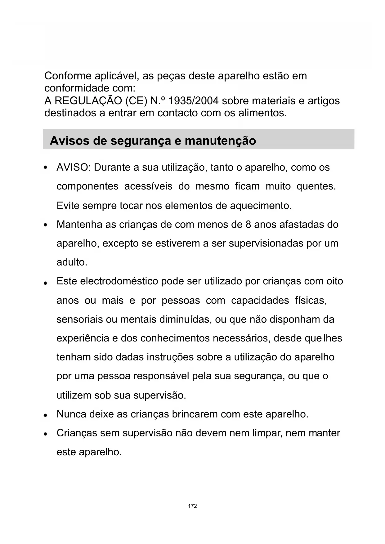 PORTUGUESE Limpeza e manutenção A superfície da placa de indução pode ser limpa, segundo um dos processos indicados no quadro abaixo: Tipo de sujidade Como limpar Material a utilizar na limpeza Pouco sujo Molhar com água quente e depois secar Esponja Muito sujo Molhar com água quente e secar com uma esponja abrasiva própria para vidrocerâmica Esponja especial para vidrocerâmica Incrustações Deitar vinagre branco sobre a incrustação e limpar depois com um pano macio, ou utilizar um detergente específico. Folha adesiva específica para vidrocerâmica Açúcar, plástico ou alumínio fundido Para remover os resíduos, utilizar um raspador próprio para vidrocerâmica (para proteger o vidro, é preferível utilizar produtos à base de silicone) Folha adesiva específica para vidrocerâmica Nota: Antes de qualquer operação de limpeza, desligue sempre o aparelho da rede eléctrica. Avarias e soluções Em caso de anomalia, a placa de indução activa automaticamente as suas funções de protecção e dispara os códigos de protecção correspondentes: Problema Causa possível Solução F0/F1/F2 Avaria da ventoinha Contactar o fornecedor F3-F8 Avaria no sensor de temperatura Contactar o fornecedor E1/E2 Tensão eléctrica anómala Verificar se há corrente eléctrica. Após a verificação, ligar de novo o aparelho E3/E4 Temperatura anómala Verificar a panela E5/E6 Irradiação de calor insuficiente Ligar de novo o aparelho depois de arrefecido Esta uma lista das avarias mais comuns. Não desmonte a placa de indução por si, para evitar perigos e não provocar danos maiores. SERVIÇO DE ASSISTÊNCIA A CLIENTES Antes de chamar o serviço de Assistência Técnica Se o aparelho não funcionar, aconselhamos: — Verificar se a ficha está bem adaptada na tomada de corrente; — Verificar o quadro de avarias indicado acima. Se não conseguir localizar a causa do problema de funcionamento: desligue o aparelho, não lhe mexa e chame o Serviço de Assistência Técnica.184 Declaração especial Todo o conteúdo deste manual foi submetido a cuidadosa verificação. No entanto, o fabricante declina toda e qualquer responsabilidade por erros ou omissões na impressão. Além disso, numa eventual revisão do Manual de Instruções, o fabricante reserva-se o direito de introduzir eventuais alterações técnicas, sem qualquer aviso prévio. O aspecto e cor do equipamento correspondem aos do produto actual. ATENÇÃO!:Não eliminar este produto como resíduo doméstico. É necessário que seja recolhido separadamente, para submeter a tratamento especial. Este electrodoméstico está marcado de acordo com a Directiva Europeia 2012/19/CE sobre eliminação de resíduos de equipamentos eléctricos e electrónicos (REEE). Respeitando as directivas impostas sobre a eliminação deste produto, contribuirá para prevenir potenciais efeitos negativos para o meio ambiente e a saúde que, diversamente, poderiam decorrer da sua eliminação inadequada. Este símbolo aplicado no produto indica que não pode ser eliminado como resíduo doméstico normal e que tem de ser levado a um centro de recolha selectiva próprio para reciclagem de equipamentos eléctricos e electrónicos. Para mais informações sobre o tratamento, eliminação e reciclagem deste produto, contacte os serviços municipalizados locais ou dirija-se à loja onde comprou o aparelho.185 Varnostni ukrepi in vzdrževanje Pri prikljuþitvi vgradite varnostno stikalo . Kuhalna plošþa ni primerna za uporabo na prostem Nikoli ne potapljajte indukcijske kuhalne plošþe v vodo . Ne vklapljajte kuhališþa, þe ja na njem prazna posoda. S kuhalno plošþo in povzroþili nevarnost. Nikoli ne segrevajte hermetiþno zaprtih posod, npr. konzerv – vedno jih najprej odprite, saj v nasprotnem primeru obstaja Po dolgotrajnem kuhanju ostane kuhališþe vroþe. þete ne dotikajte se steklokeramiþne površine z golo roko. Obþasno se prepriþajte, da so odprtine za zra þenje þo proste in da lahko zrak neovirano kroži. Ne odlagajte kovinskih predmetov (npr. nožev, vilic, plošþo, saj bi se lahko ti segreli. Ne uporabljajte kuhalne plošþe v bližini drugih naprav, temperaturo (npr. štedilnik na plin ali peþ na kerozin). V omarici pod kuhalno plošþo ne hranite þistil ali drugih vnetljivih snovi. Na kuhalno plošþo ne postavljajte posod z grobim dnom, saj bi te lahko poškodovale steklokeramiþno površino. Redno þ istite steklokerami þno površino, da prepre þite, da bi onemogoþilo brezhibno delovanje aparata. ýe se prikljuþni kabel poškoduje, ga mora zamenjati pooblašþeni serviser ali druga ustrezno usposobljena oseba. nevarnost, da eksplodirajo Pazite, da se ne ope pod kuhalno ploš žlic ali pokrovk) na kuhalno ki proizvajajo visoko tem bi lahko poškodovali tujki zašli v ventilator, kar bi Deli te naprave so po potrebi skladni z: UREDBO EVROPSKEGA PARLAMENTA IN SVETA (ES) št, 1935/2004 o materialih in izdelkih, namenjenih za stik z živili. SLOVENIAN186 OPOZORILO: Aparat in njegovi dostopni deli se med uporabo segrejejo. Pazite, da se ne dotaknete grelcev! Otroci, mlajši od 8 let, naj se aparatu ne približujejo nenadzorovani. Otroci, starejši od 8 let, ter osebe z zmanjšanimi fizičnimi, zaznavnimi ali umskimi sposobnostmi ali pomanjkljivimi izkušnjami ter znanjem lahko uporabljajo aparat le pod nadzorom oseb, ki so odgovorne za njihovo varnost, in ki so jih seznanili z varno uporabo aparata ter le v primeru, da razumejo tveganje, ki je s tem povezano. Otroci se ne smejo igrati z aparatom. Otroci lahko sodelujejo pri čiščenju in vzdrževalnih delih le pod nadzorom odraslih. OPOZORILO: Pri segrevanju maščobe ali olja se ne oddaljujte od aparata, saj se te snovi zlahka vnamejo in povzročijo požar. NIKOLI ne gasite ognja z vodo, ampak izklopite aparat in nato pokrijte plamen - npr. s pokrovko ali primerno nevnetljivo krpo ali odejo. OPOZORILO: Nevarnost vžiga! Na kuhalno površino ne odlagajte nikakršnih predmetov