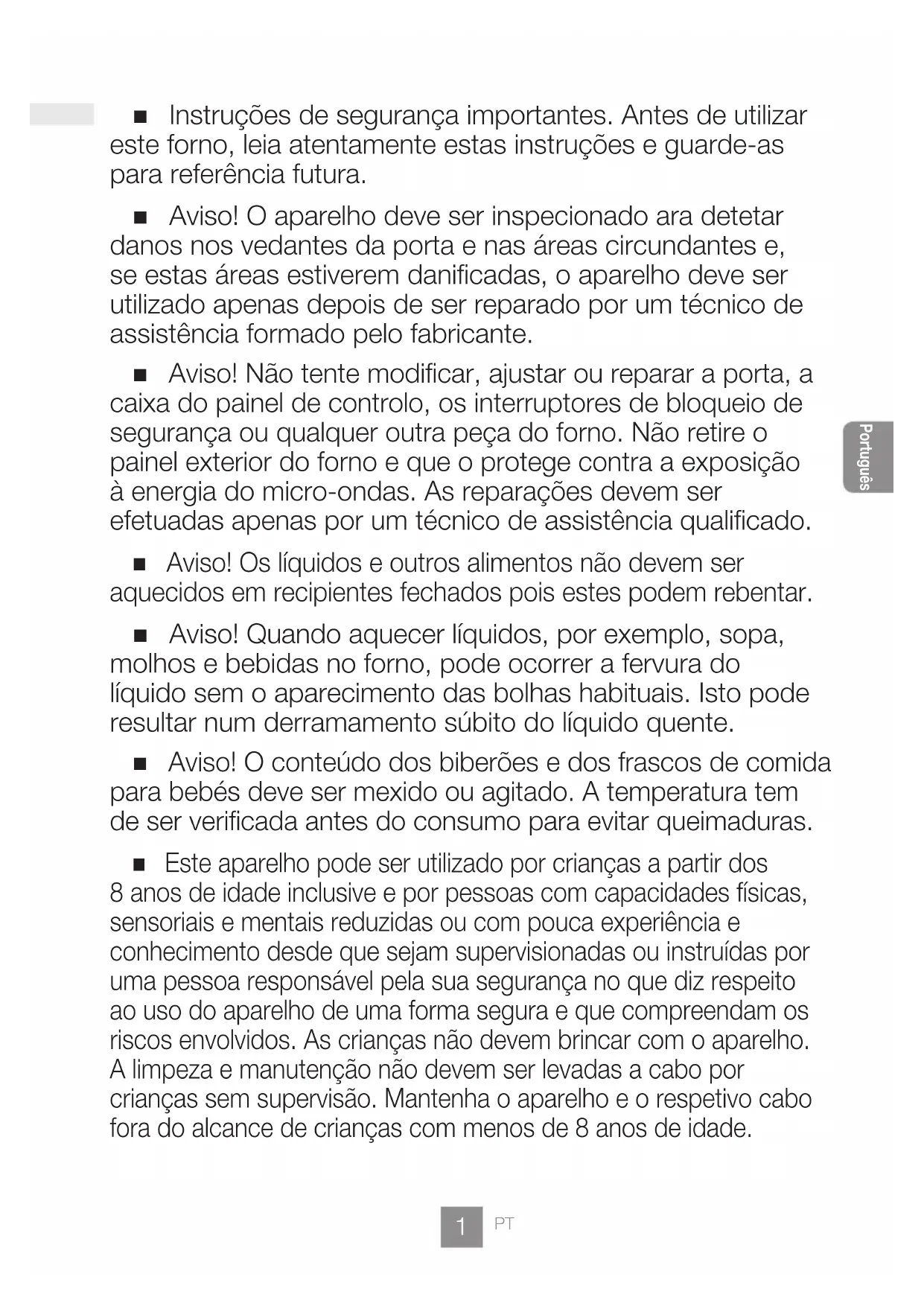 Português Instruções de segurança importantes. Antes de utilizar este forno, leia atentamente estas instruções e guarde-as para referência futura. Aviso! O aparelho deve ser inspecionado ara detetar danos nos vedantes da porta e nas áreas circundantes e, se estas áreas estiverem danificadas, o aparelho deve ser utilizado apenas depois de ser reparado por um técnico de assistência formado pelo fabricante. Aviso! Não tente modificar, ajustar ou reparar a porta, a caixa do painel de controlo, os interruptores de bloqueio de segurança ou qualquer outra peça do forno. Não retire o painel exterior do forno e que o protege contra a exposição à energia do micro-ondas. As reparações devem ser efetuadas apenas por um técnico de assistência qualificado. Aviso! Os líquidos e outros alimentos não devem ser aquecidos em recipientes fechados pois estes podem rebentar. Aviso! Quando aquecer líquidos, por exemplo, sopa, molhos e bebidas no forno, pode ocorrer a fervura do líquido sem o aparecimento das bolhas habituais. Isto pode resultar num derramamento súbito do líquido quente. Aviso! O conteúdo dos biberões e dos frascos de comida para bebés deve ser mexido ou agitado. A temperatura tem de ser verificada antes do consumo para evitar queimaduras. Este aparelho pode ser utilizado por crianças a partir dos 8 anos de idade inclusive e por pessoas com capacidades físicas, sensoriais e mentais reduzidas ou com pouca experiência e conhecimento desde que sejam supervisionadas ou instruídas por uma pessoa responsável pela sua segurança no que diz respeito ao uso do aparelho de uma forma segura e que compreendam os riscos envolvidos. As crianças não devem brincar com o aparelho. A limpeza e manutenção não devem ser levadas a cabo por crianças sem supervisão. Mantenha o aparelho e o respetivo cabo fora do alcance de crianças com menos de 8 anos de idade.2 3
