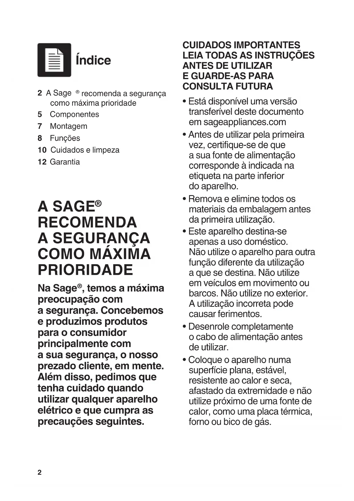 - Coloque o aparelho numa superfície plana, estável, resistente ao calor e seca, afastado da extremidade e não utilize próximo de uma fonte de calor, como uma placa térmica, forno ou bico de gás. 2 A Sage recomenda a segurança como máxima prioridade5 Componentes7 Montagem8 Funções10 Cuidados e limpeza12 Garantia Índice3