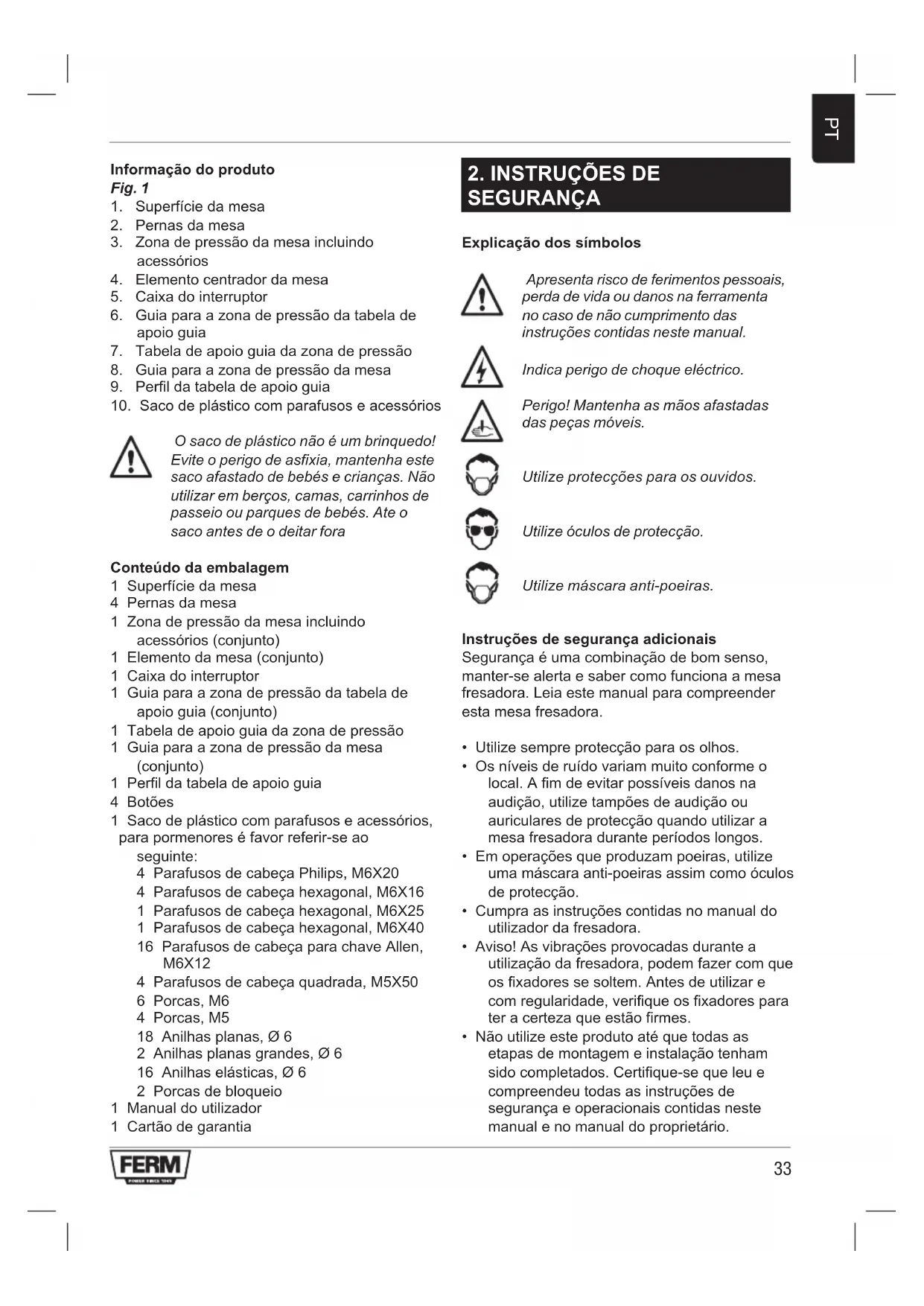O saco de plástico não é um brinquedo! Evite o perigo de asfixia, mantenha este saco afastado de bebés e crianças. Não utilizar em berços, camas, carrinhos de passeio ou parques de bebés. Ate o saco antes de o deitar fora Conteúdo da embalagem 1 Superfície da mesa 4 Pernas da mesa 1 Zona de pressão da mesa incluindo acessórios (conjunto) 1 Elemento da mesa (conjunto) 1 Caixa do interruptor 1 Guia para a zona de pressão da tabela de apoio guia (conjunto) 1 Tabela de apoio guia da zona de pressão 1 Guia para a zona de pressão da mesa (conjunto) 1 Perfil da tabela de apoio guia 4 Botões 1 Saco de plástico com parafusos e acessórios, para pormenores é favor referir-se ao seguinte: 4 Parafusos de cabeça Philips, M6X20 4 Parafusos de cabeça hexagonal, M6X16 1 Parafusos de cabeça hexagonal, M6X25 1 Parafusos de cabeça hexagonal, M6X40 16 Parafusos de cabeça para chave Allen, M6X12 4 Parafusos de cabeça quadrada, M5X50 6 Porcas, M6 4 Porcas, M5 18 Anilhas planas, Ø 6 2 Anilhas planas grandes, Ø 6 16 Anilhas elásticas, Ø 6 2 Porcas de bloqueio 1 Manual do utilizador 1 Cartão de garantia