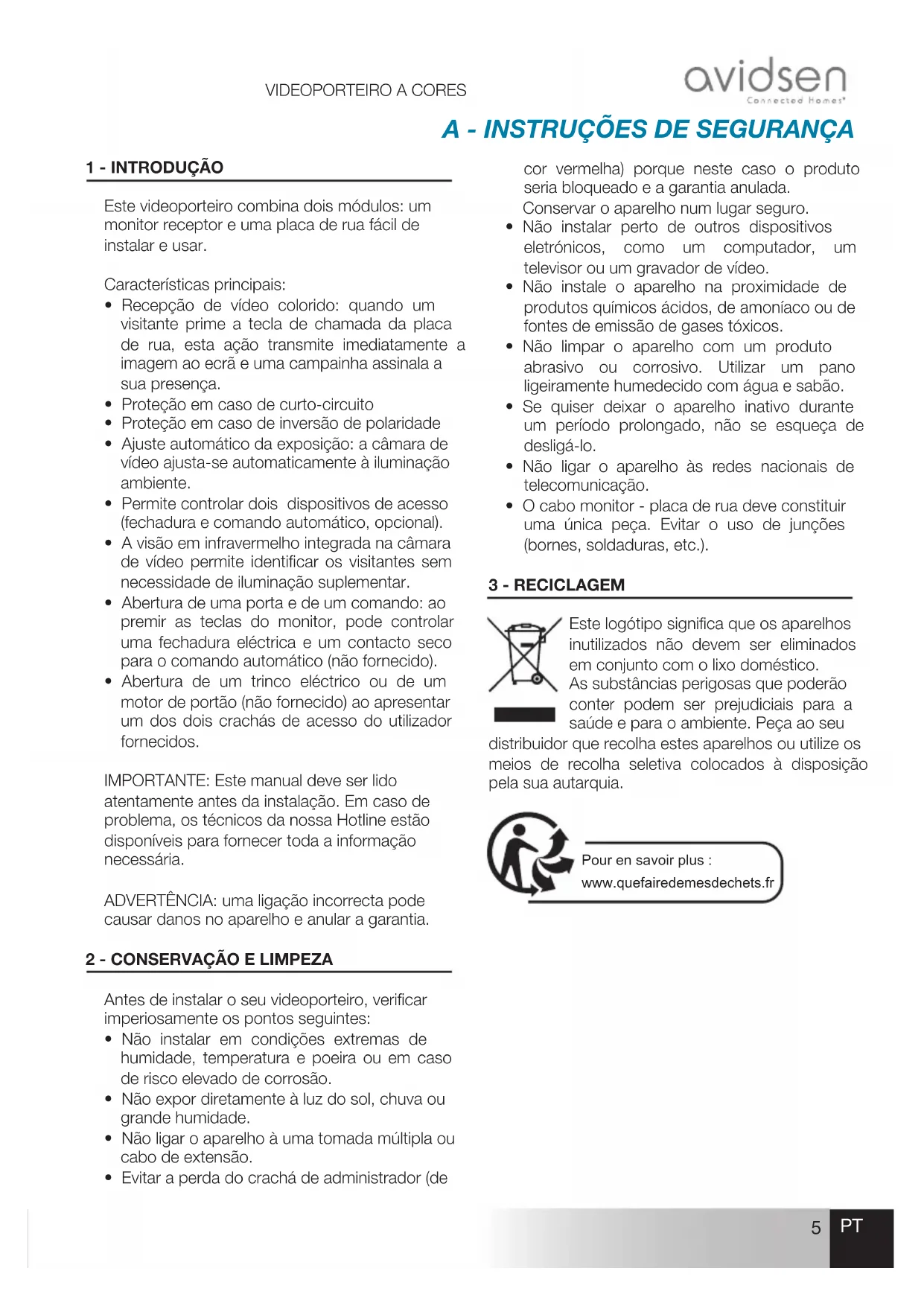 - Nenhum elemento deste produto deve ser aberto ou reparado por pessoas estranhas à empresa Avidsen.