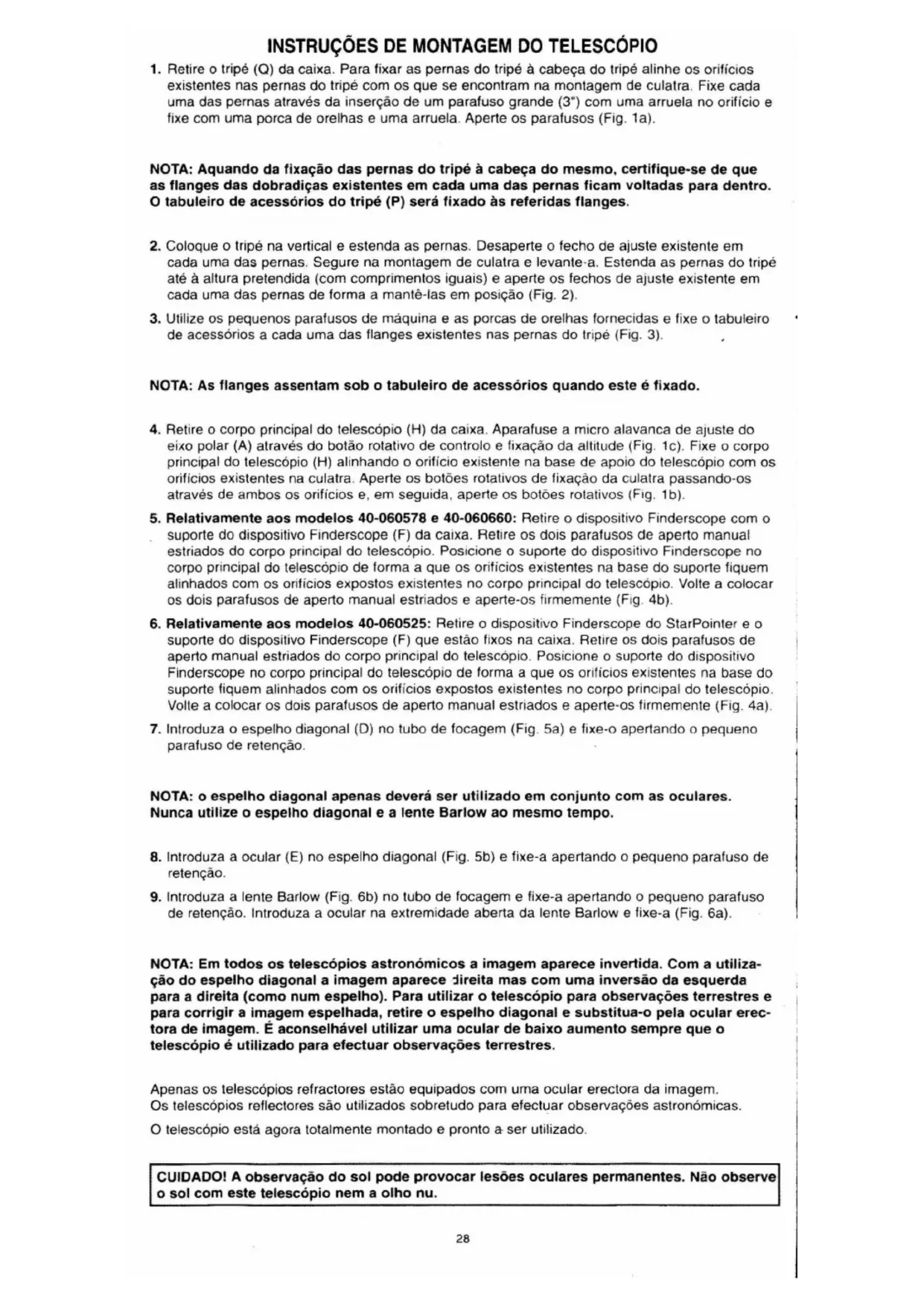 de retenção . Introduza a ocular na extremidade aberta da lente Barlow e fixe-a (Fig. 6a) . NOTA: Em todos os telescópios astronómicos a imagem aparece invertida . Com a utiliza- ção do espelho diagonal a imagem aparece direita mas com uma inversão da esquerda para a direita (como num espelho). Para utilizar o telescópio para observações terrestres e para corrigir a imagem espelhada, retire o espelho diagonal e substitua-o pela ocular erec- tora de imagem . É aconselhável utilizar uma ocular de baixo aumento sempre que o telescópio é utilizado para efectuar observações terrestres. Apenas os telescópios refractores estão equipados com uma ocular erectora da imagem. Os telescópios reflectores são utilizados sobretudo para efectuar observações astronómicas. O telescópio está agora totalmente montado e pronto a ser utilizado . CUIDADO! A observação do sol pode provocar lesões oculares permanentes. Não observe o sol com este telescópio nem a olho nu. 283. Para centrar o objecto com o ponto vermelho existente no dispositivo StarPointer utilize o anel de ajuste da nitidez existente na haste do conjunto de movimentação da altitude em câmara lenta.