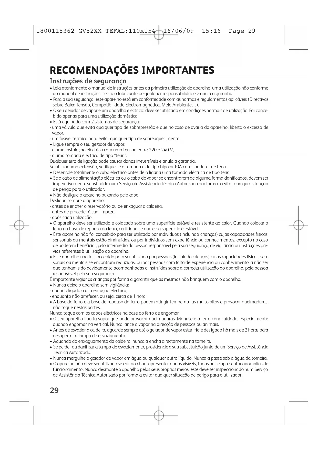 - O aparelho não deve ser utilizado se cair ao chão, apresentar danos visíveis, fugas ou se apresentar anomalias de funcionamento. Nunca desmonte o aparelho pelos seus próprios meios: este deve ser inspeccionado num Serviço de Assistência Técnica Autorizado por forma a evitar qualquer situação de perigo para o utilizador. 1800115362 GV52XX TEFAL:110x154 16/06/09 15:16 Page 2930
