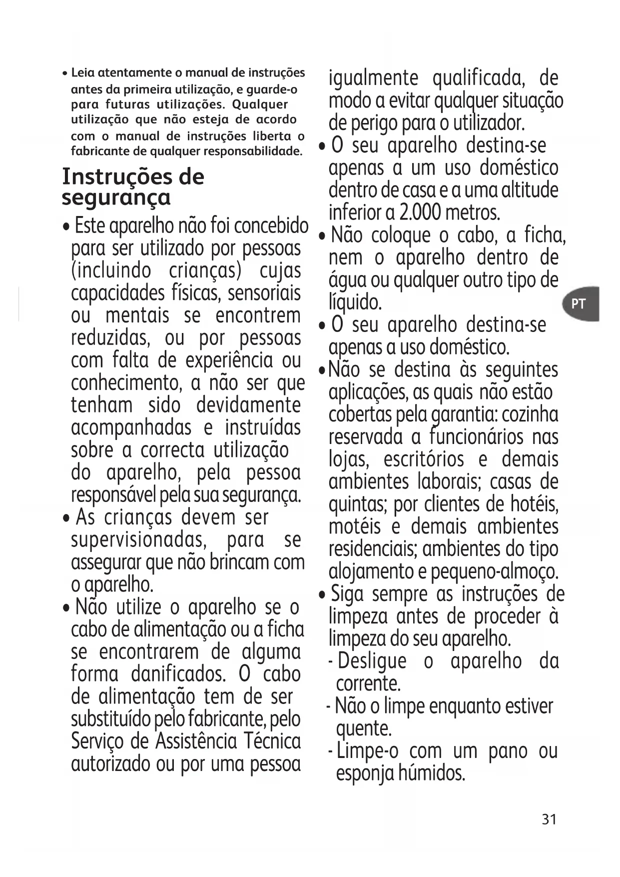 - Siga sempre as instruções de limpeza antes de proceder à limpeza do seu aparelho. - Desligue o aparelho da corrente. - Não o limpe enquanto estiver quente. - Limpe-o com um pano ou esponja húmidos. PT32 - Nunca o mergulhe dentro de água nem o coloque sob água corrente.