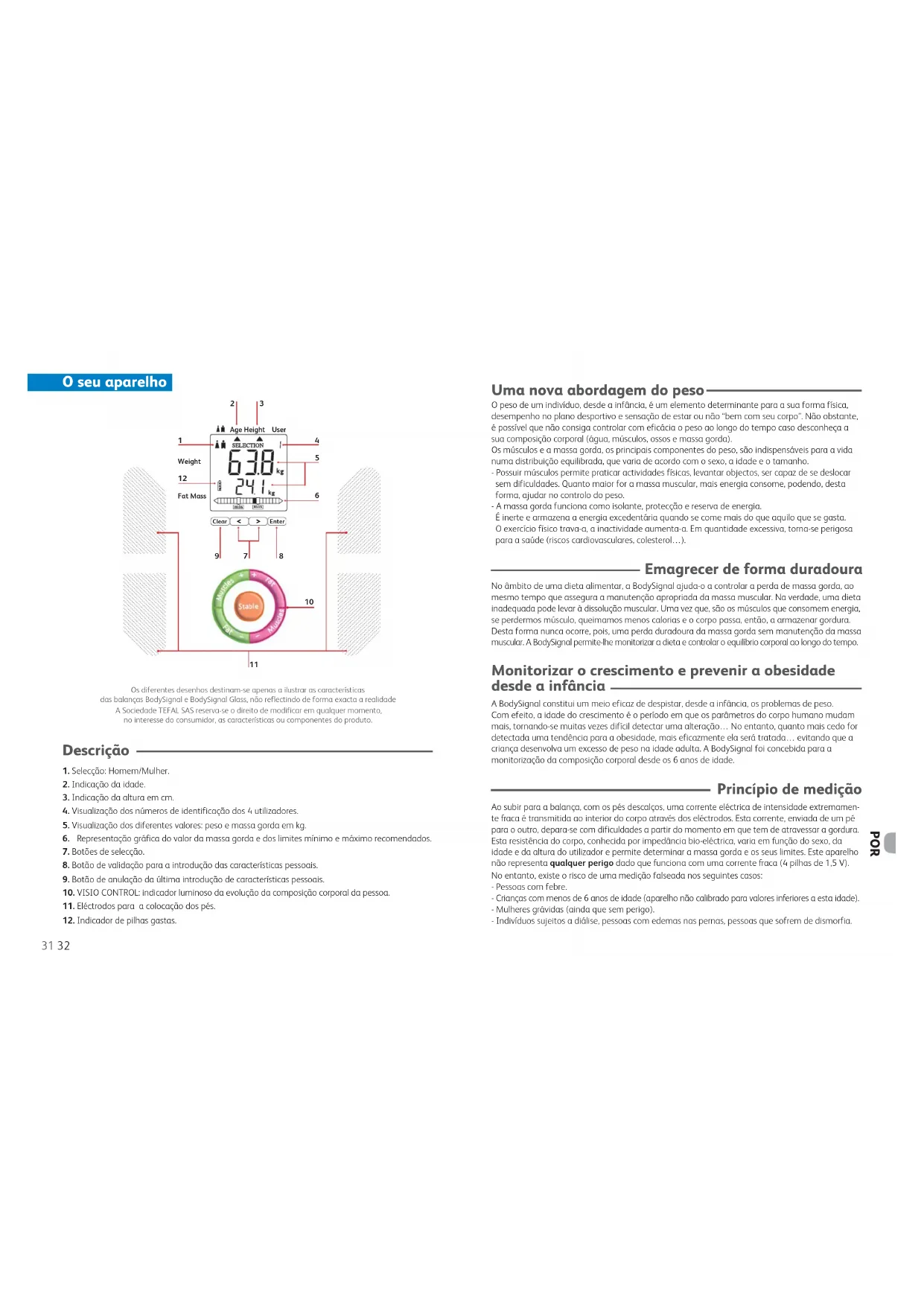 Os diferentes desenhos destinam-se apenas a ilustrar as características das balanças BodySignal e BodySignal Glass, não reflectindo de forma exacta a realidade A Sociedade TEFAL SAS reserva-se o direito de modificar em qualquer momento, no interesse do consumidor, as características ou componentes do produto. Uma nova abordagem do peso O peso de um indivíduo, desde a infância, é um elemento determinante para a sua forma física, desempenho no plano desportivo e sensação de estar ou não “bem com seu corpo”. Não obstante, é possível que não consiga controlar com eficácia o peso ao longo do tempo caso desconheça a sua composição corporal (água, músculos, ossos e massa gorda). Os músculos e a massa gorda, os principais componentes do peso, são indispensáveis para a vida numa distribuição equilibrada, que varia de acordo com o sexo, a idade e o tamanho. - Possuir músculos permite praticar actividades físicas, levantar objectos, ser capaz de se deslocar sem dificuldades. Quanto maior for a massa muscular, mais energia consome, podendo, desta forma, ajudar no controlo do peso. - A massa gorda funciona como isolante, protecção e reserva de energia. É inerte e armazena a energia excedentária quando se come mais do que aquilo que se gasta. O exercício físico trava-a, a inactividade aumenta-a. Em quantidade excessiva, torna-se perigosa para a saúde (riscos cardiovasculares, colesterol…). Emagrecer de forma duradoura No âmbito de uma dieta alimentar, a BodySignal ajuda-o a controlar a perda de massa gorda, ao mesmo tempo que assegura a manutenção apropriada da massa muscular. Na verdade, uma dieta inadequada pode levar à dissolução muscular. Uma vez que, são os músculos que consomem energia, se perdermos músculo, queimamos menos calorias e o corpo passa, então, a armazenar gordura. Desta forma nunca ocorre, pois, uma perda duradoura da massa gorda sem manutenção da massa muscular. A BodySignal permite-lhe monitorizar a dieta e controlar o equilíbrio corporal ao longo do tempo. Monitorizar o crescimento e prevenir a obesidade desde a infância A BodySignal constitui um meio eficaz de despistar, desde a infância, os problemas de peso. Com efeito, a idade do crescimento é o período em que os parâmetros do corpo humano mudam mais, tornando-se muitas vezes difícil detectar uma alteração… No entanto, quanto mais cedo for detectada uma tendência para a obesidade, mais eficazmente ela será tratada… evitando que a criança desenvolva um excesso de peso na idade adulta. A BodySignal foi concebida para a monitorização da composição corporal desde os 6 anos de idade. Princípio de medição Ao subir para a balança, com os pés descalços, uma corrente eléctrica de intensidade extremamen- te fraca é transmitida ao interior do corpo através dos eléctrodos. Esta corrente, enviada de um pé para o outro, depara-se com dificuldades a partir do momento em que tem de atravessar a gordura. Esta resistência do corpo, conhecida por impedância bio-eléctrica, varia em função do sexo, da idade e da altura do utilizador e permite determinar a massa gorda e os seus limites. Este aparelho não representa qualquer perigo dado que funciona com uma corrente fraca (4 pilhas de 1,5 V). No entanto, existe o risco de uma medição falseada nos seguintes casos: - Pessoas com febre. - Crianças com menos de 6 anos de idade (aparelho não calibrado para valores inferiores a esta idade). - Mulheres grávidas (ainda que sem perigo). - Indivíduos sujeitos a diálise, pessoas com edemas nas pernas, pessoas que sofrem de dismorfia.POR As funções da BODYSIGNAL A BodySignal proporciona um seguimento personalizado:• Mede e indica:- o peso em kg- a massa gorda em kg contida no seu corpo.Exibe este resultado num gráfico em função dos seus limites mínimo e máximo (calculados deacordo com o sexo, idade e altura).O objectivo é assegurar-se que o seu resultado se situa dentro dos limites.Excesso de massa gorda.Modifique os seus hábitos alimentares e pratique uma actividade física.A massa gorda está abaixo do limite inferior. Será aconselhável aumentar a massa gorda, na medida em que essaconstitui a reserva de energia do corpo.