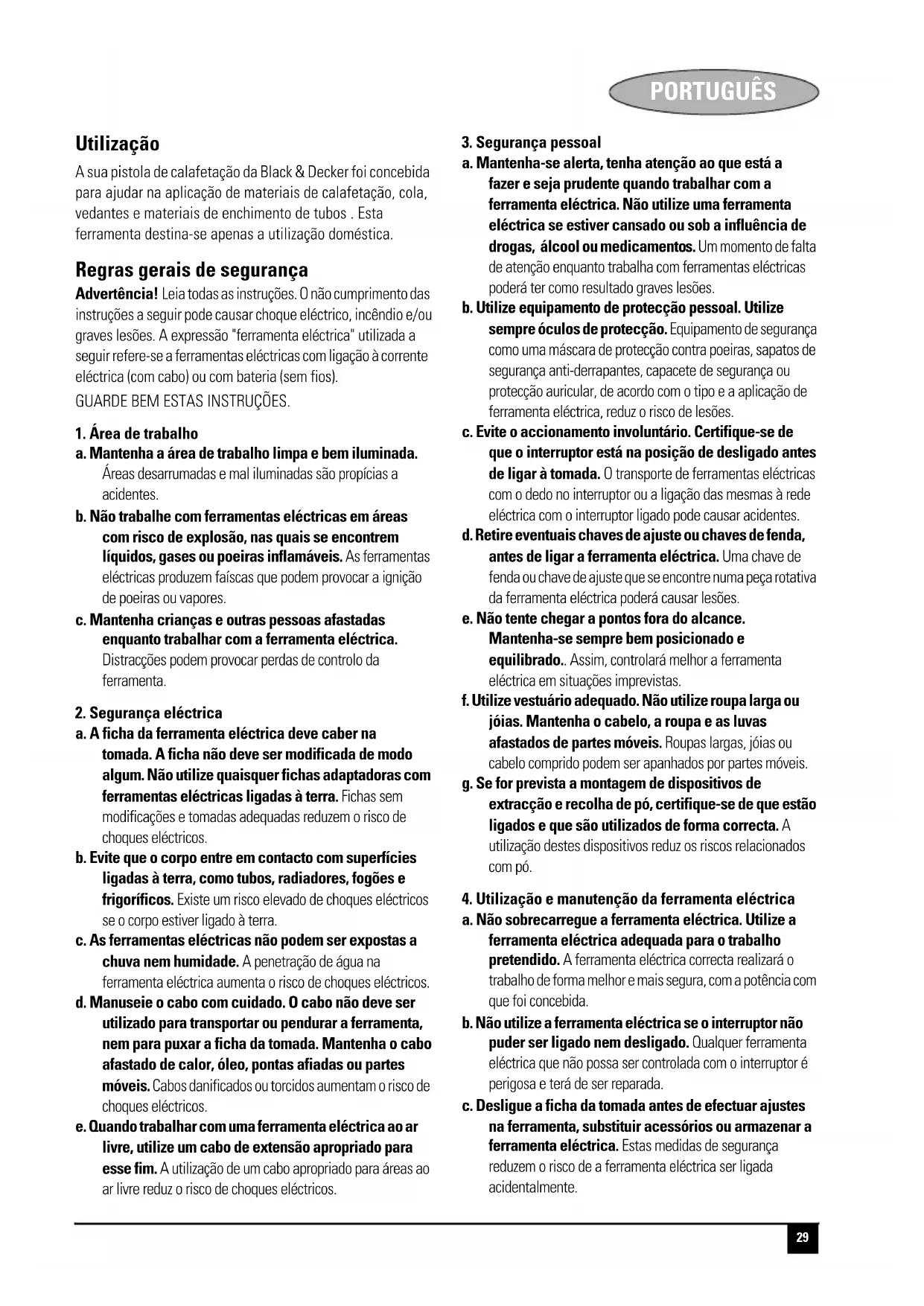 LpA (pressão acústica) 61,6 dB(A), LWA (potência acústica) 72,6 dB(A), vibração medida da mão/do braço 0,18 m/s2, KpA (imprecisão da pressão acústica) 3 dB(A), Kwa (imprecisão de potência acústica) 3 dB(A), Kevin Hewitt Director de Engenharia de Consumo Spennymoor, County Durham DL16 6JG, Reino Unido 06-12-2006 Garantia A Black & Decker confia na qualidade dos seus produtos e oferece uma garantia excelente. Esta declaração de garantia é um complemento dos seus direitos estabelecidos por lei, não os prejudicando de forma alguma. A garantia é válida nos territórios dos Estados Membros da União Europeia e da Associação Europeia de Comércio Livre. Se um produto Black & Decker se avariar devido a defeitos de material, fabrico ou não conformidade, num período de 24 meses após a data da compra, a Black & Decker garante a substituição de peças defeituosas, a reparação de produtos sujeitos a um desgaste aceitável ou a substituição dos mesmos para garantir o mínimo de inconveniente ao cliente, excepto se: X O produto tiver sido utilizado para fins comerciais, profissionais ou de aluguer. X O produto tiver sido submetido a utilização indevida ou descuido. X O produto tiver sido danificado por objectos estranhos, substâncias ou acidentes. X Tiverem sido tentadas reparações por pessoas que não sejam agentes de reparação autorizados ou técnicos de manutenção da Black & Decker. Para accionar a garantia, terá de apresentar comprovativos de compra ao vendedor ou a um agente de reparação autorizado. Pode verificar a localização do agente de reparação autorizado mais perto de si, contactando os escritórios locais da Black & Decker através do endereço indicado neste manual. Se preferir, pode encontrar na Internet uma lista de agentes de reparação autorizados Black & Decker, detalhes completos e contactos do serviço pós-venda, no endereço: www.2helpU.com CG100 Tensão Vdc 6 Sem velocidade de carga mm/min 90 - 150 Tamanho das pilhas Tipo LR06 (AA) Peso g 95033 PORTUGUÊS Visite o nosso website www.blackanddecker.eu para registar o novo produto Black & Decker e manter-se actualizado relativamente a novos produtos e ofertas especiais. Pode encontrar mais informações sobre a marca Black & Decker e nossa gama de produtos em www.blackanddecker.eu.34 SVENSKA Svenska Användningsområde Denna fogpistol från Black & Decker är avsedd att underlätta vid appliceringen av fog, lim, tätningsmedel och fyllnadsmaterial på tub. Verktyget är endast avsett som konsumentverktyg. Allmänna säkerhetsregler Varning! Samtliga anvisningar ska läsas. Om anvisningarna nedan inte följs kan det orsaka elektriska stötar, brand och/eller allvarliga kroppsskador. Begreppet "Elverktyg" i varningarna nedan avser nätdrivna elverktyg (med nätsladd) och batteridrivna elverktyg (sladdlösa). SPARA DESSA SÄKERHETSANVISNINGAR.