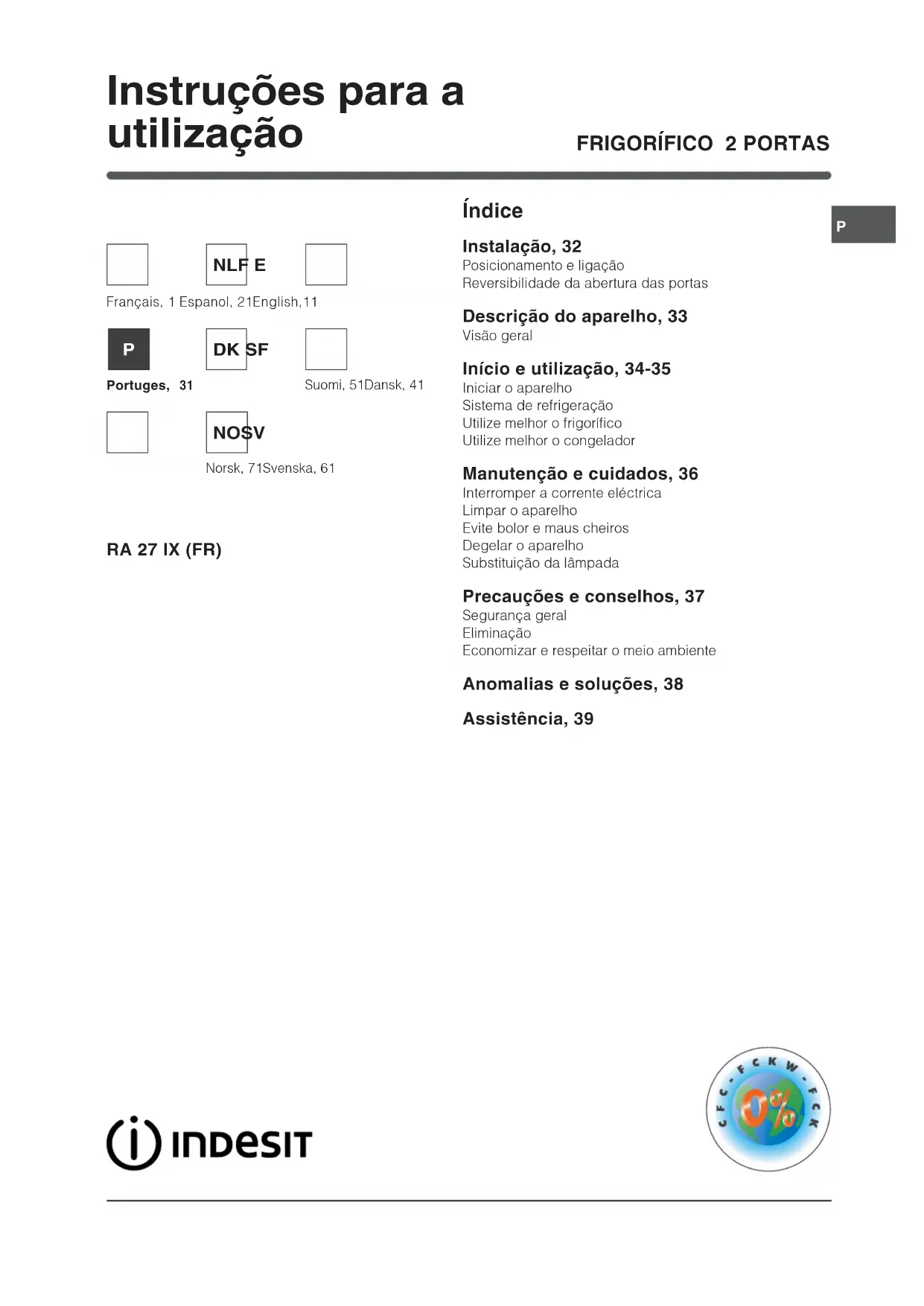 Índice Instalação, 32 Posicionamento e ligação Reversibilidade da abertura das portas Descrição do aparelho, 33 Visão geral Início e utilização, 34-35 Iniciar o aparelho Sistema de refrigeração Utilize melhor o frigorífico Utilize melhor o congelador Manutenção e cuidados, 36 Interromper a corrente eléctrica Limpar o aparelho Evite bolor e maus cheiros Degelar o aparelho Substituição da lâmpada Precauções e conselhos, 37 Segurança geral Eliminação Economizar e respeitar o meio ambiente Anomalias e soluções, 38 Assistência, 39 Instruções para a utilização RA 27 IX (FR) Français, 1 Espanol, 21English,11 NLF E Portuges,