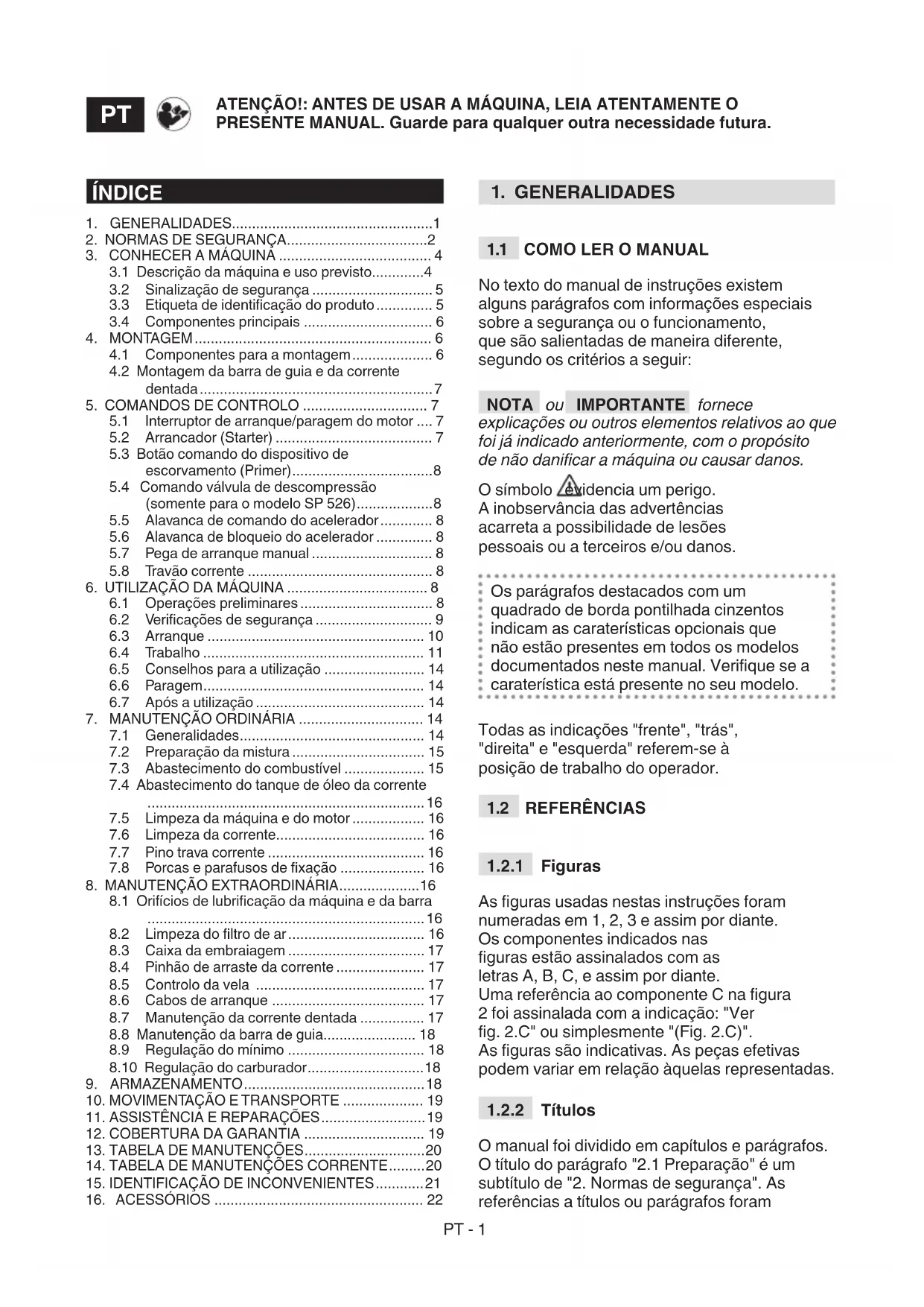 O manual foi dividido em capítulos e parágrafos. O título do parágrafo "2.1 Preparação" é um subtítulo de "2. Normas de segurança". As referências a títulos ou parágrafos foram ATENÇÃO!: ANTES DE USAR A MÁQUINA, LEIA ATENTAMENTE O PRESENTE MANUAL. Guarde para qualquer outra necessidade futura.