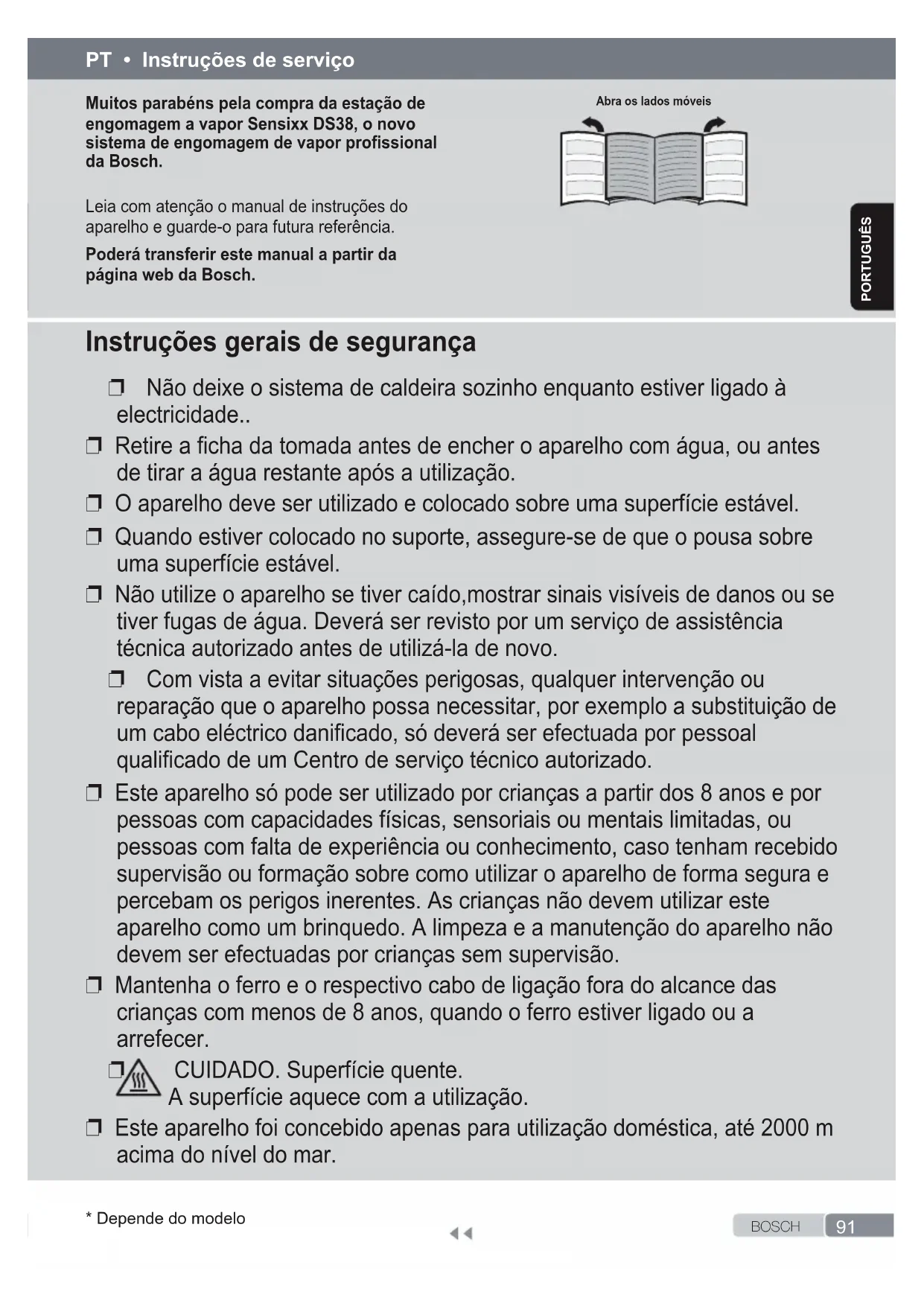B O S C H* Depende do modeloporTUgUêS Muitos parabéns pela compra da estação de engomagem a vapor Sensixx DS38, o novo sistema de engomagem de vapor prossional da Bosch. Leia com atenção o manual de instruções do aparelho e guarde-o para futura referência. Poderá transferir este manual a partir da página web da Bosch. Abra os lados móveis Instruções gerais de segurança ❐ Não deixe o sistema de caldeira sozinho enquanto estiver ligado à electricidade.. ❐ Retire a ficha da tomada antes de encher o aparelho com água, ou antes de tirar a água restante após a utilização. ❐ O aparelho deve ser utilizado e colocado sobre uma superfície estável. ❐ Quando estiver colocado no suporte, assegure-se de que o pousa sobre uma superfície estável. ❐ Não utilize o aparelho se tiver caído,mostrar sinais visíveis de danos ou se tiver fugas de água. Deverá ser revisto por um serviço de assistência técnica autorizado antes de utilizá-la de novo. ❐ Com vista a evitar situações perigosas, qualquer intervenção ou reparação que o aparelho possa necessitar, por exemplo a substituição de um cabo eléctrico danificado, só deverá ser efectuada por pessoal qualificado de um Centro de serviço técnico autorizado. ❐ Este aparelho só pode ser utilizado por crianças a partir dos 8 anos e por pessoas com capacidades físicas, sensoriais ou mentais limitadas, ou pessoas com falta de experiência ou conhecimento, caso tenham recebido supervisão ou formação sobre como utilizar o aparelho de forma segura e percebam os perigos inerentes. As crianças não devem utilizar este aparelho como um brinquedo. A limpeza e a manutenção do aparelho não devem ser efectuadas por crianças sem supervisão. ❐ Mantenha o ferro e o respectivo cabo de ligação fora do alcance das crianças com menos de 8 anos, quando o ferro estiver ligado ou a arrefecer.