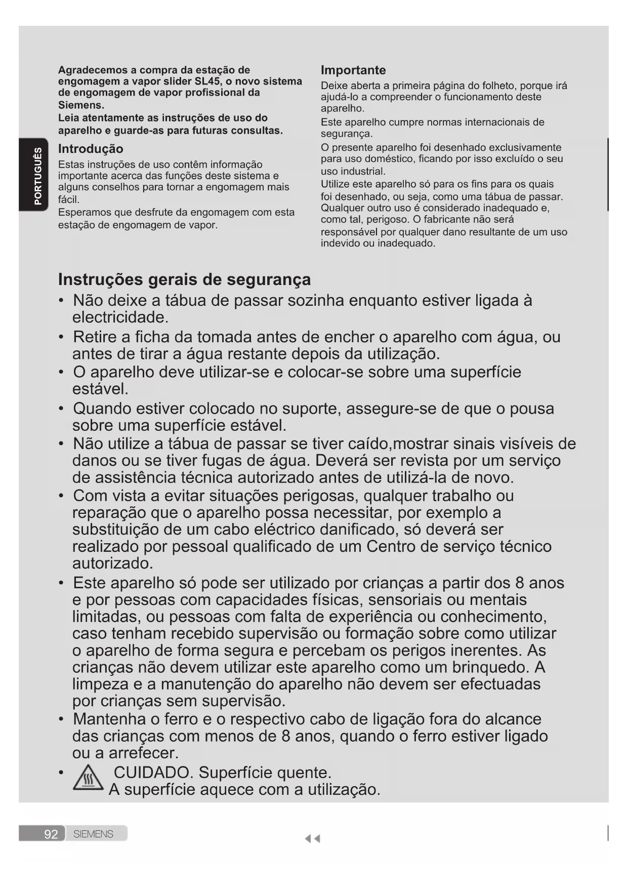 Este aparelho alcança temperaturas elevadas e produz vapor durante a sua utilização, que podem causar escaldões ou queimaduras em caso de utilização indevida. A mangueira de vapor, a estação de base, a chapa metálica na parte de baixo do suporte do ferro amovível (2) e, em particular, o ferro, podem aquecer com a utilização. É normal acontecer. Não dirija o vapor a pessoas ou animais. Não permita que o cabo entre em contacto com a base do ferro de engomar quando esta estiver quente. Tenha em atenção que o sistema pode continuar a ejectar vapor durante mais algum tempo, depois de soltar o gatilho de ejecção de vapor. É normal que isto ocorra.94 S I E M E N S