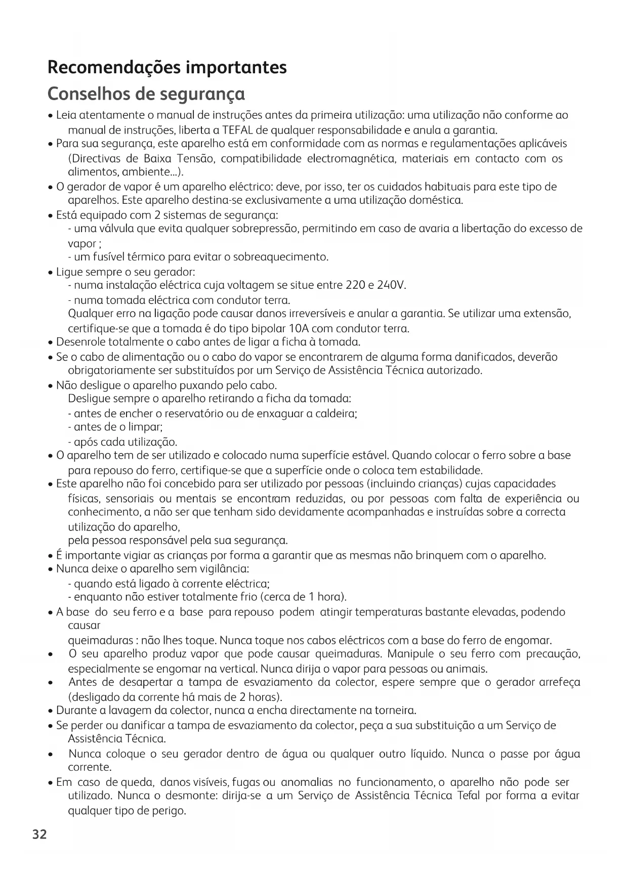 - Leia atentamente o manual de instruções antes da primeira utilização: uma utilização não conforme ao manual de instruções, liberta a TEFAL de qualquer responsabilidade e anula a garantia.
