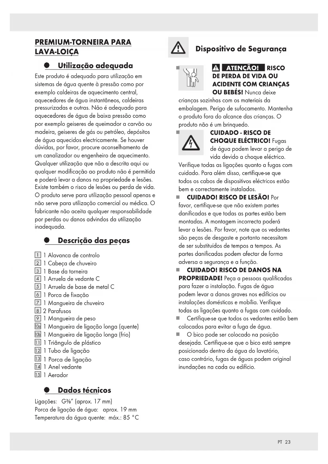 PROPRIEDADE! Peça a pessoas qualificadas para fazer a instalação. Fugas de água podem levar a danos graves nos edifícios ou instalações domésticas e mobília. Verifique todas as ligações quanto a fugas com cuidado. Certifique-se que todos os vedantes estão bem colocados para evitar a fuga de água. O bico pode ser colocado na posição desejada. Certifique-se que o bico está sempre posicionado dentro da água do lavatório, caso contrário, fugas de águas podem original inundações na cada ou edifício.24