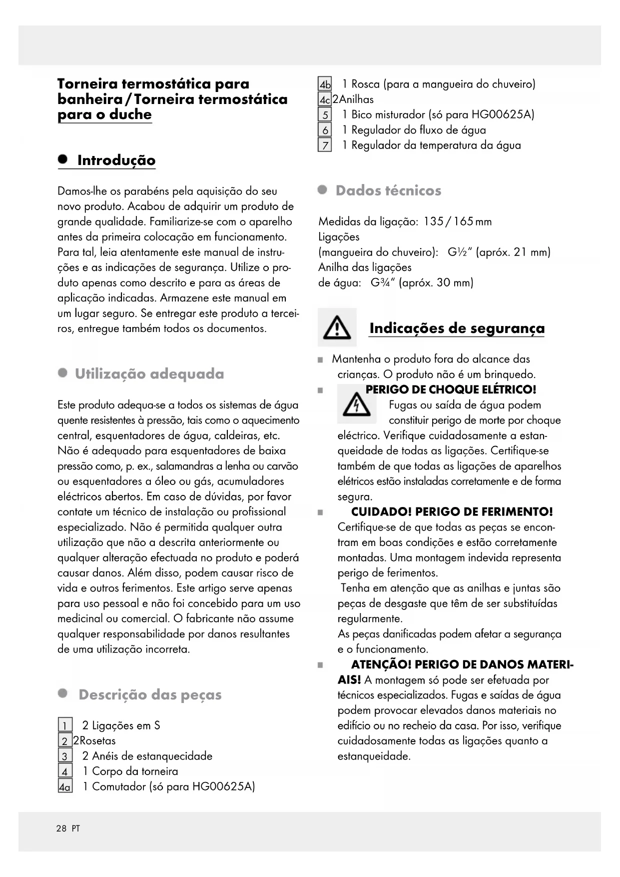 1 Regulador da temperatura da água Dados técnicos Medidas da ligação: 135 / 165 mm Ligações (mangueira do chuveiro): G½“ (apróx. 21 mm) Anilha das ligações de água: G¾“ (apróx. 30 mm) Indicações de segurança Mantenha o produto fora do alcance das crianças. O produto não é um brinquedo. PERIGO DE CHOQUE ELÉTRICO! Fugas ou saída de água podem constituir perigo de morte por choque eléctrico. Verifique cuidadosamente a estan- queidade de todas as ligações. Certifique-se também de que todas as ligações de aparelhos elétricos estão instaladas corretamente e de forma segura. CUIDADO! PERIGO DE FERIMENTO! Certifique-se de que todas as peças se encon- tram em boas condições e estão corretamente montadas. Uma montagem indevida representa perigo de ferimentos. Tenha em atenção que as anilhas e juntas são peças de desgaste que têm de ser substituídas regularmente. As peças danificadas podem afetar a segurança e o funcionamento.