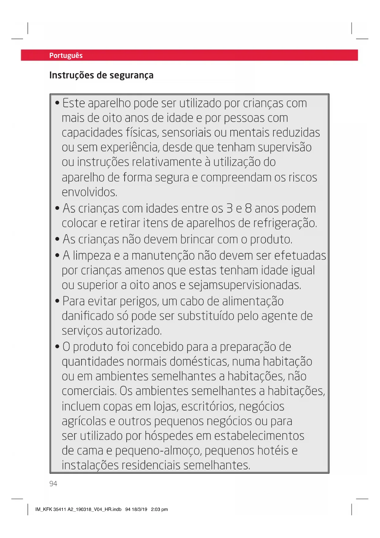 - O produto foi concebido para a preparação de quantidades normais domésticas, numa habitação ou em ambientes semelhantes a habitações, não comerciais. Os ambientes semelhantes a habitações, incluem copas em lojas, escritórios, negócios agrícolas e outros pequenos negócios ou para ser utilizado por hóspedes em estabelecimentos de cama e pequeno-almoço, pequenos hotéis e instalações residenciais semelhantes. IM_KFK 35411 A2_190318_V04_HR.indb 94 18/3/19 2:03 pmPortuguês