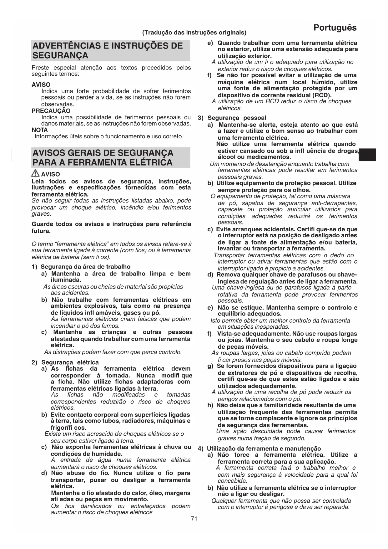 a) As fi chas da ferramenta elétrica devem corresponder à tomada. Nunca modifi que a fi cha. Não utilize fi chas adaptadoras com ferramentas elétricas ligadas à terra. As fi chas não modifi cadas e tomadas correspondentes reduzirão o risco de choques elétricos. b) Evite contacto corporal com superfícies ligadas à terra, tais como tubos, radiadores, máquinas e frigorífi cos. Existe um risco acrescido de choques elétricos se o seu corpo estiver ligado à terra. c) Não exponha ferramentas elétricas à chuva ou condições de humidade. A entrada de água numa ferramenta elétrica aumentará o risco de choques elétricos. d) Não abuse do fi o. Nunca utilize o fi o para transportar, puxar ou desligar a ferramenta elétrica. Mantenha o fi o afastado do calor, óleo, margens afi adas ou peças em movimento. Os fi os danifi cados ou entrelaçados podem aumentar o risco de choques elétricos. (Tradução das instruções originais) 00BookCH3656DA.indb7100BookCH3656DA.indb71 2024/02/289:56:412024/02/289:56:4172 Português c) Desligue a fi cha da fonte de alimentação e/ ou remova a bateria da ferramenta elétrica, se removível, antes de efetuar quaisquer regulações, mudar os acessórios ou armazenar ferramentas elétricas. Tais medidas de segurança de prevenção reduzem o risco de ligar a ferramenta elétrica acidentalmente. d) Armazene as ferramentas elétricas fora do alcance das crianças e não permita que pessoas não familiarizadas com a ferramenta elétrica ou com estas instruções utilizem a ferramenta. As ferramentas elétricas são perigosas nas mãos de utilizadores inexperientes. e) Efetue a manutenção das ferramentas elétricas e acessórios. Verifi que a existência de desalinhamentos ou dobragens das peças móveis, quebras de peças e quaisquer outras condições que possam afetar o funcionamento da ferramenta elétrica. Se danifi cada, mande reparar a ferramenta antes de utilizar. Muitos acidentes são causados por ferramentas com má manutenção. f) Mantenha as ferramentas de corte afi adas e limpas. As ferramentas de corte com uma manutenção adequada e extremidades afi adas são menos propensas a dobrar e mais fáceis de controlar. g) Utilize a ferramenta elétrica, acessórios e brocas de ferramentas, etc., de acordo com estas instruções, tendo em consideração as condições de trabalho e o trabalho a ser efetuado. A utilização de uma ferramenta elétrica para operações diferentes das previstas pode resultar numa situação perigosa. h) Mantenha as pegas e as superfícies de manuseamento secas, limpas e livres de óleo e graxa. Pegas de manuseamento escorregadias não permitem a manipulação segura e controlo da ferramenta em situações inesperadas.