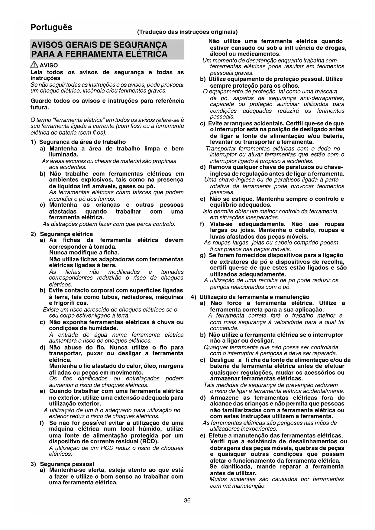 AVISO Leia todos os avisos de segurança e todas as instruções Se não seguir todas as instruções e os avisos, pode provocar um choque elétrico, incêndio e/ou ferimentos graves. Guarde todos os avisos e instruções para referência futura. O termo “ferramenta elétrica” em todos os avisos refere-se à sua ferramenta ligada à corrente (com fi os) ou à ferramenta elétrica de bateria (sem fi os).