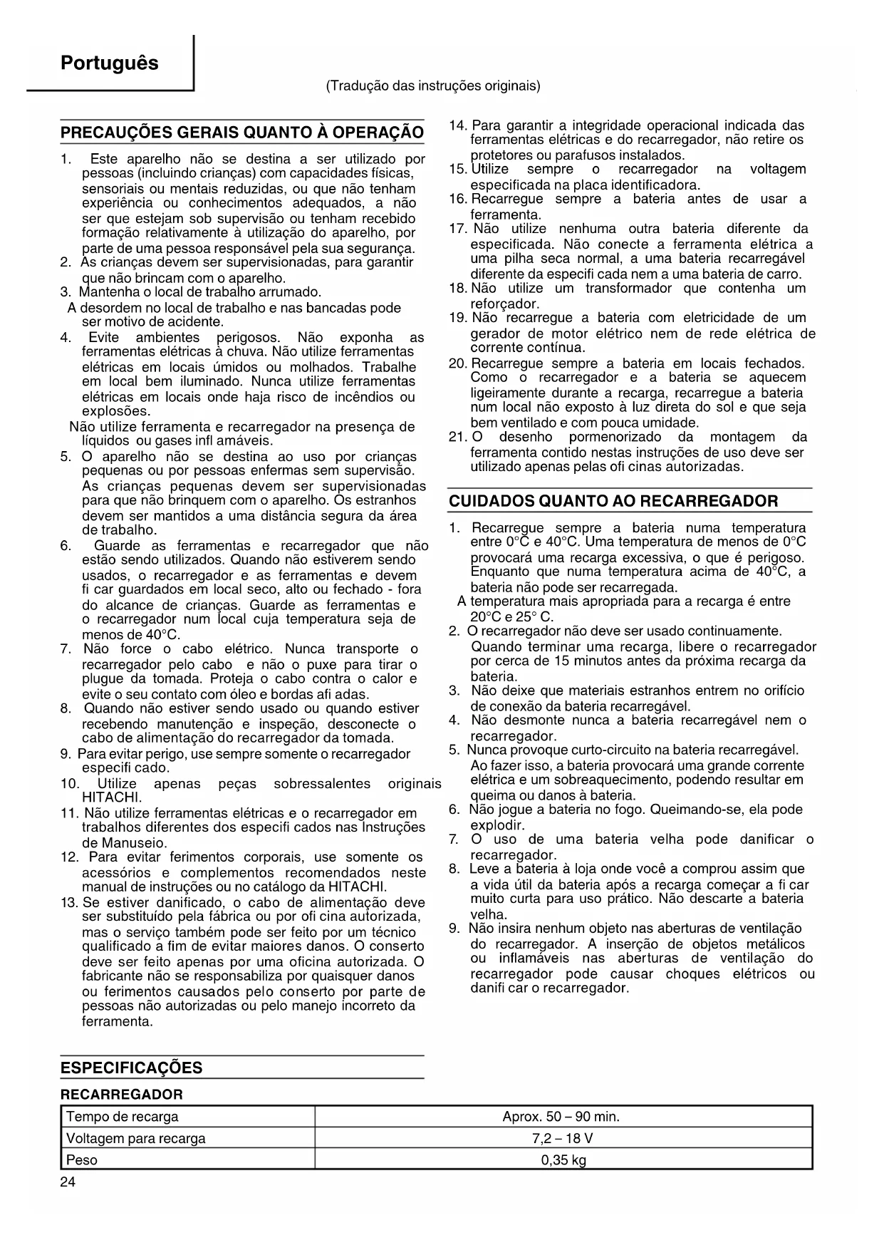 do recarregador. A inserção de objetos metálicos ou infl amáveis nas aberturas de ventilação do recarregador pode causar choques elétricos ou danifi car o recarregador. (Tradução das instruções originais) ESPECIFICAÇÕES RECARREGADOR Tempo de recarga Aprox. 50 – 90 min. Voltagem para recarga 7,2 – 18 V Peso 0,35 kg 000BookUC18YKWE+NE.indb24000BookUC18YKWE+NE.indb24 2010/02/0118:15:312010/02/0118:15:3125 Português APLICAÇÃO Para recarregar a BATERIA HITACHI. ○ EB712S, EB7S, EB714S, FEB7S, EB7B, BCC912, EB912S, EB9S, EB914S, EB914, FEB9S, EB9B, EB924, BCC1212, EB1212S, EB12S, EB1214S, EB1214L, FEB12S, EB12B, EB1220BL, EB1224, BCC1412, EB1412S, EB1414S, EB1414, EB14B, EB1424, EB1812S, BCC1812, EB1814SL, EB18B, EB1820, EB1820L, EB1824L RECARGA Antes de usar a ferramenta elétrica, recarregue a bateria da seguinte forma.