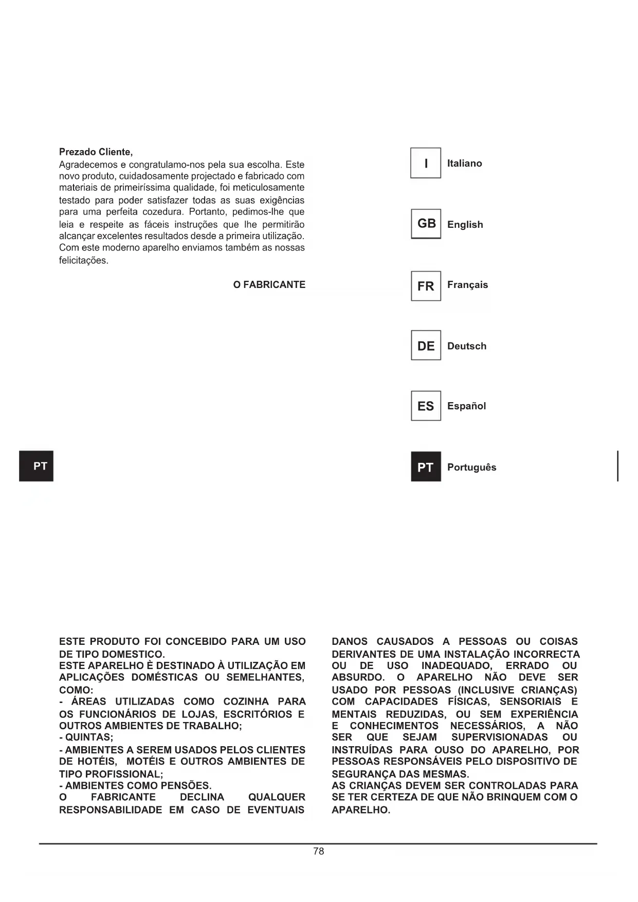 SEGURANÇA DAS MESMAS. AS CRIANÇAS DEVEM SER CONTROLADAS PARA SE TER CERTEZA DE QUE NÃO BRINQUEM COM O APARELHO. Prezado Cliente, Agradecemos e congratulamo-nos pela sua escolha. Este novo produto, cuidadosamente projectado e fabricado com materiais de primeiríssima qualidade, foi meticulosamente testado para poder satisfazer todas as suas exigências para uma perfeita cozedura. Portanto, pedimos-lhe que leia e respeite as fáceis instruções que lhe permitirão alcançar excelentes resultados desde a primeira utilização. Com este moderno aparelho enviamos também as nossas felicitações. O FABRICANTE Italiano