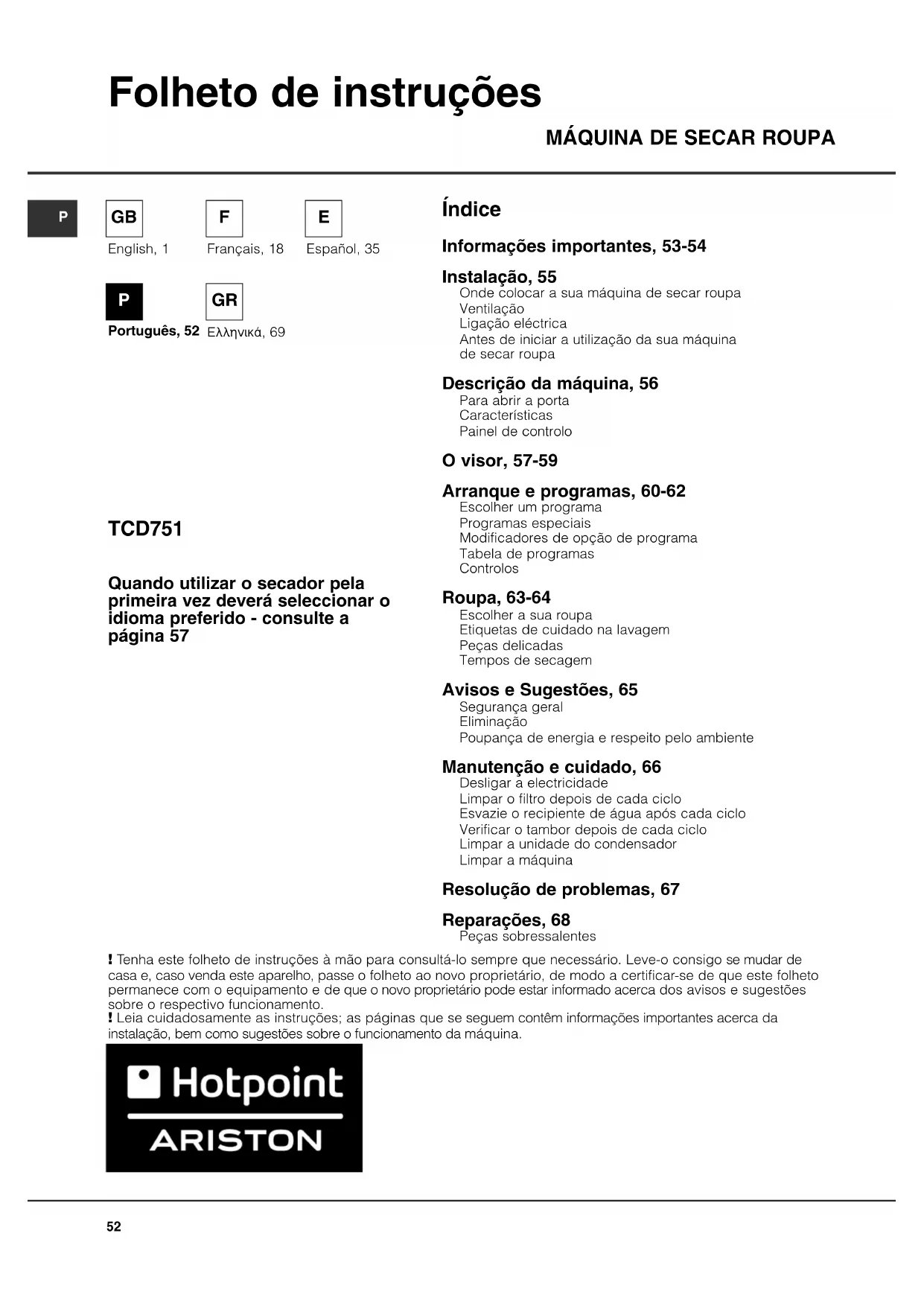 TCD751 Quando utilizar o secador pela primeira vez deverá seleccionar o idioma preferido - consulte a página 57 Folheto de instruções Informações importantes, 53-54 Instalação, 55 Onde colocar a sua máquina de secar roupa Ventilação Ligação eléctrica Antes de iniciar a utilização da sua máquina de secar roupa Descrição da máquina, 56 Para abrir a porta Características Painel de controlo O visor, 57-59 Arranque e programas, 60-62 Escolher um programa Programas especiais Modificadores de opção de programa Tabela de programas Controlos Roupa, 63-64 Escolher a sua roupa Etiquetas de cuidado na lavagem Peças delicadas Tempos de secagem Avisos e Sugestões, 65 Segurança geral Eliminação Poupança de energia e respeito pelo ambiente Manutenção e cuidado, 66 Desligar a electricidade Limpar o filtro depois de cada ciclo Esvazie o recipiente de água após cada ciclo Verificar o tambor depois de cada ciclo Limpar a unidade do condensador Limpar a máquina Resolução de problemas, 67 Reparações, 68 Peças sobressalentes