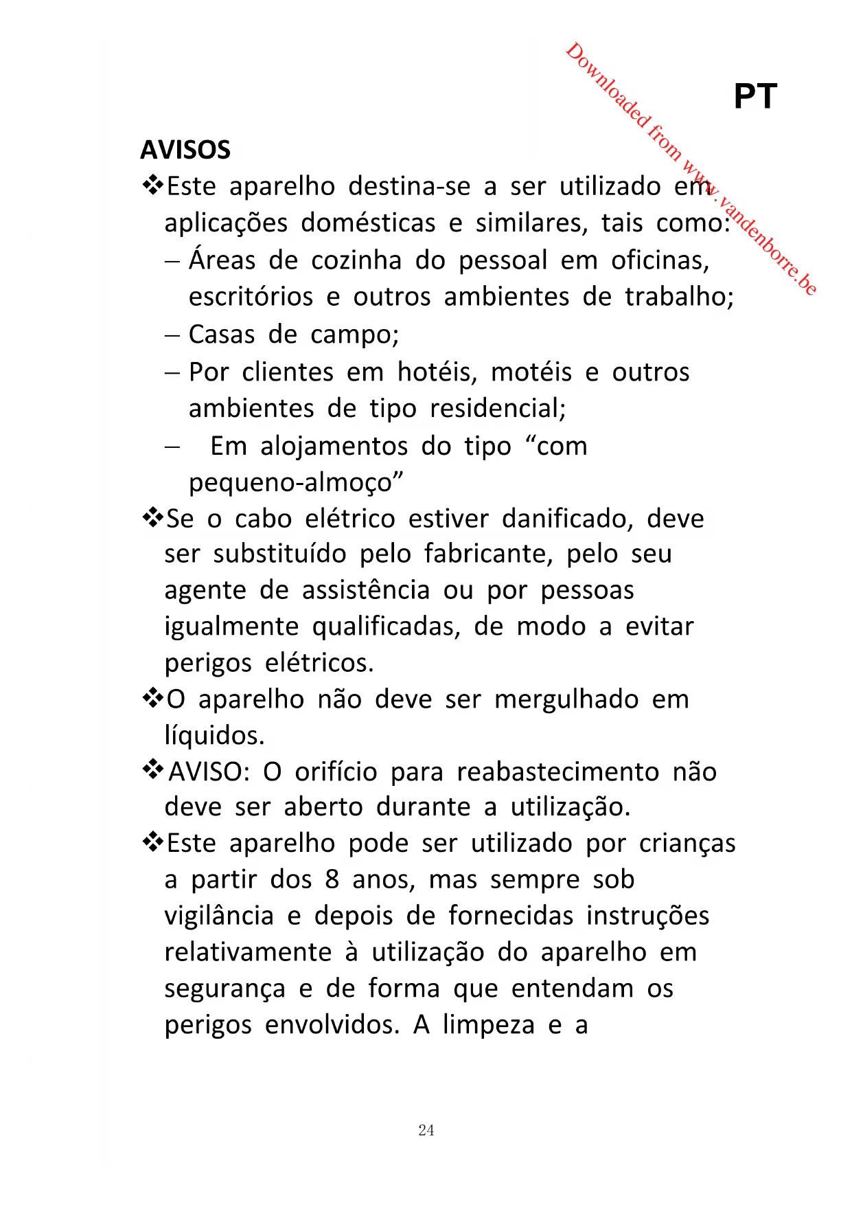 Downloaded from www.vandenborre.beAVISOS Este aparelho destina-se a ser utilizado em aplicações domésticas e similares, tais como: