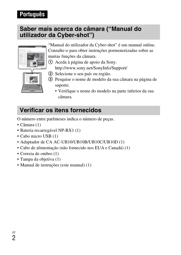 Português Saber mais acerca da câmara (“Manual do utilizador da Cyber-shot”) “Manual do utilizador da Cyber-shot” é um manual online. Consulte-o para obter instruções pormenorizadas sobre as muitas funções da câmara. 1 Aceda à página de apoio da Sony. http://www.sony.net/SonyInfo/Support/ 2 Selecione o seu país ou região. 3 Pesquise o nome de modelo da sua câmara na página de suporte.