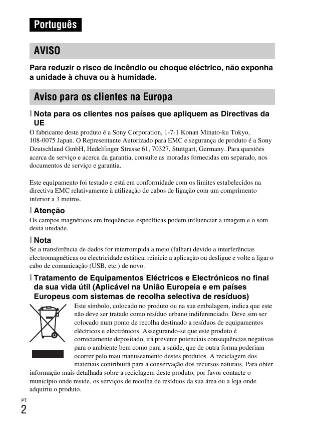 Português AVISO Para reduzir o risco de incêndio ou choque eléctrico, não exponha a unidade à chuva ou à humidade. Aviso para os clientes na Europa [ Nota para os clientes nos países que apliquem as Directivas da O fabricante deste produto é a Sony Corporation, 1-7-1 Konan Minato-ku Tokyo, 108-0075 Japan. O Representante Autorizado para EMC e segurança de produto é a Sony Deutschland GmbH, Hedelfinger Strasse 61, 70327, Stuttgart, Germany. Para questões acerca de serviço e acerca da garantia, consulte as moradas fornecidas em separado, nos documentos de serviço e garantia. Este equipamento foi testado e está em conformidade com os limites estabelecidos na directiva EMC relativamente à utilização de cabos de ligação com um comprimento inferior a 3 metros. [ Atenção Os campos magnéticos em frequências específicas podem influenciar a imagem e o som desta unidade. [ Nota Se a transferência de dados for interrompida a meio (falhar) devido a interferências electromagnéticas ou electricidade estática, reinicie a aplicação ou desligue e volte a ligar o cabo de comunicação (USB, etc.) de novo. [ Tratamento de Equipamentos Eléctricos e Electrónicos no final da sua vida útil (Aplicável na União Europeia e em países Europeus com sistemas de recolha selectiva de resíduos) Este símbolo, colocado no produto ou na sua embalagem, indica que este não deve ser tratado como resíduo urbano indiferenciado. Deve sim ser colocado num ponto de recolha destinado a resíduos de equipamentos eléctricos e electrónicos. Assegurando-se que este produto é correctamente depositado, irá prevenir potenciais consequências negativas para o ambiente bem como para a saúde, que de outra forma poderiam ocorrer pelo mau manuseamento destes produtos. A reciclagem dos materiais contribuirá para a conservação dos recursos naturais. Para obter informação mais detalhada sobre a reciclagem deste produto, por favor contacte o município onde reside, os serviços de recolha de resíduos da sua área ou a loja onde adquiriu o produto.