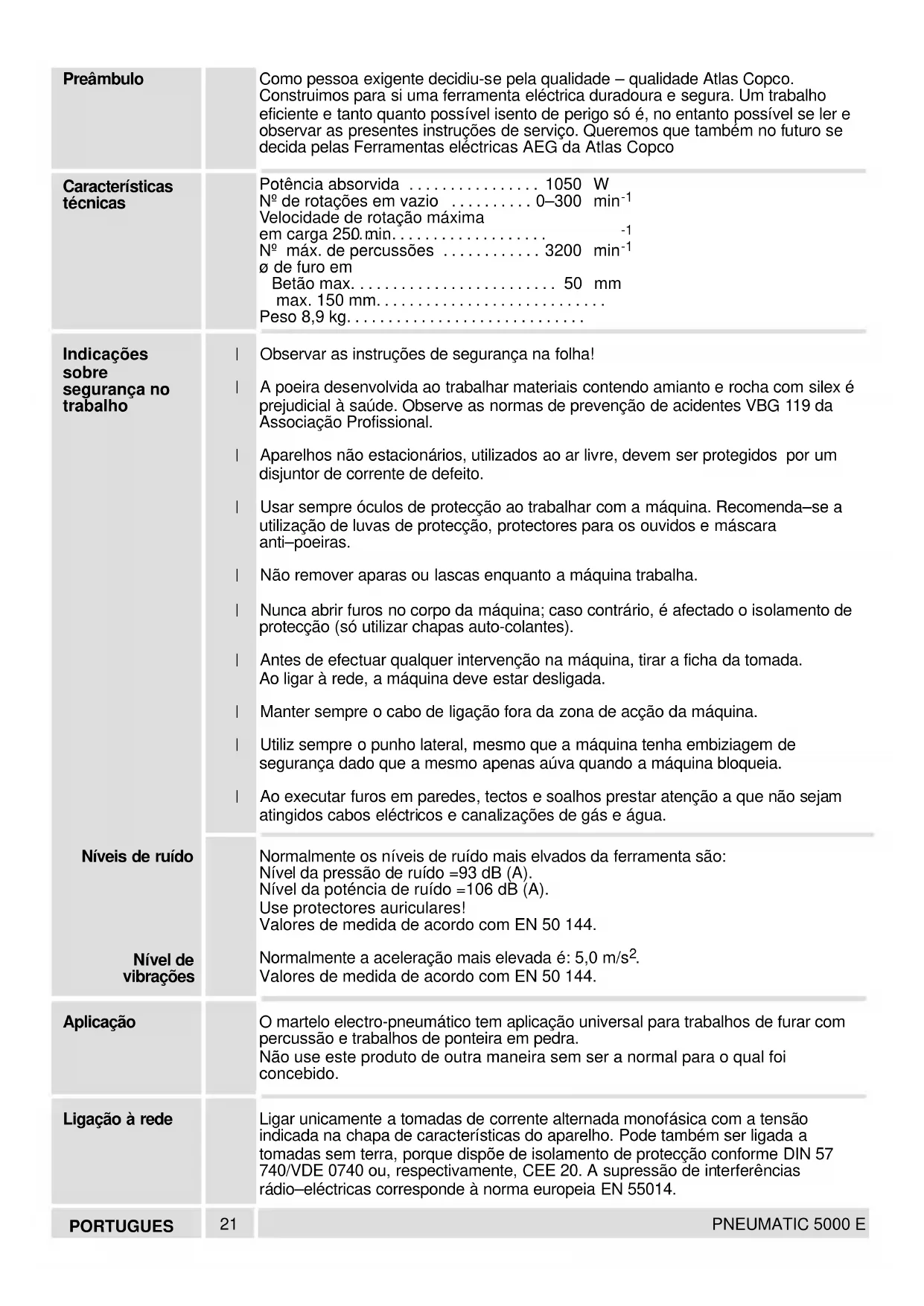 Valores de medida de acordo com EN 50 144. O martelo electro-pneumático tem aplicação universal para trabalhos de furar com percussão e trabalhos de ponteira em pedra. Não use este produto de outra maneira sem ser a normal para o qual foi concebido. Ligar unicamente a tomadas de corrente alternada monofásica com a tensão indicada na chapa de características do aparelho. Pode também ser ligada a tomadas sem terra, porque dispõe de isolamento de protecção conforme DIN 57 740/VDE 0740 ou, respectivamente, CEE 20. A supressão de interferências rádio–eléctricas corresponde à norma europeia EN 55014. Preâmbulo Características técnicas Indicações sobre segurança no trabalho Níveis de ruído Nível de vibrações Aplicação Ligação à rede22 PORTUGUES PNEUMATIC 5000 E A percussão necessária para trabalhos em pedra com broca de martelo é gerada num mecanismo de perussão pneumatico. Da mesma maneira que se bate com um martelo num escopro vulgar, percutor bate directamente numa ponteira móvel no sentido axial. O motor eléctrico imprime um movimento alternativo ao percutor através de um mecanismo oscilante – pistão – pistão livre. Entre pistão e pistão livre encontra-se uma almovada de ar (razão da designação ”mecanismo de percussão pneumático”). Obtém-se deste modo uma elevada elasticidade de percussão, evitando o recuo da m’quina durante o trabalho. O rendimento da máquina não depende da pressão de encosto. Ligar: premir o interruptor Desligar: soltar o interruptor. A velocidade de rotação pode ser variada sem escalonamento conforne a pressão exercida sobre o interruptor. Funcionamento do martelo electrro- pneumático Breve descrição Ligar–Desligar Uma embraiagem de segurança incorporada evita o arrasto da máquina quando a broca prende. Carcaça de desenho ergonómico com punho traseiro maleável (softgrip) para redução da fadiga durante o trabalho. AVS Sistema Anti–Vibraciones A unidade motor–engenagens é separada dos punhos, elementos de amortecimento absorvem as vibrações em ambos os punhos ao perfurar e demolir. Comutador com as posições furar com percussão e trabalho de ponteira. Punho suplementar ajustável com guia de profundidade integrada. Interruptor e acelerador electrónico sem escalonamento. Recepção para punho auxiliar, na parte lateral da máquina. Para furação acima da cabeça ou chão o punho auxiliar pode ser colocado na parte lateral da máquina. Alterações: Texto, figura e características correspondem ao desenvolvimento técnico à data da impressão. Reservamo-nos o direito de introduzir modificações nos nossos produtos com vista ao seu aperfeiçoamento. Buchas de martelo para ferramentas com encabadouro SDS-max – as ferramentas são automaticamente bloqueadas após inserção.23 PORTUGUES PNEUMATIC 5000 E Antes de efectuar qualquer intervenção na máquina, tirar a ficha da tomada. A bucha de martelo pode receber as seguintes ferramentas com haste SDS–max: - Brocas de martelo para betão e pedra - Ponteira de bico, Ponteira chata, Ponteira de goiva Só utilizar ferramentas com haste SDS–max!