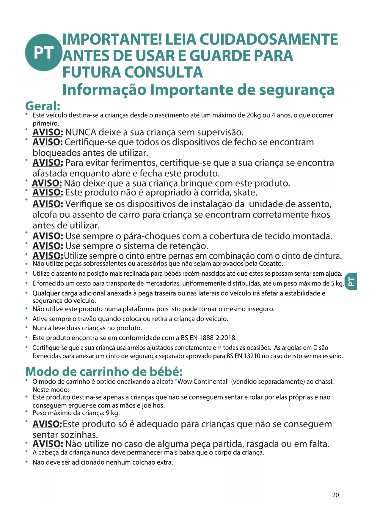 Não utilize este produto numa plataforma pois isto pode tornar o mesmo inseguro. Ative sempre o travão quando coloca ou retira a criança do veículo. Nunca leve duas crianças no produto. Este produto encontra-se em conformidade com a BS EN 1888-2:2018. Certique-se que a sua criança usa arreios ajustados corretamente em todas as ocasiões. As argolas em D são fornecidas para anexar um cinto de segurança separado aprovado para BS EN 13210 no caso de isto ser necessário. Modo de carrinho de bébé: