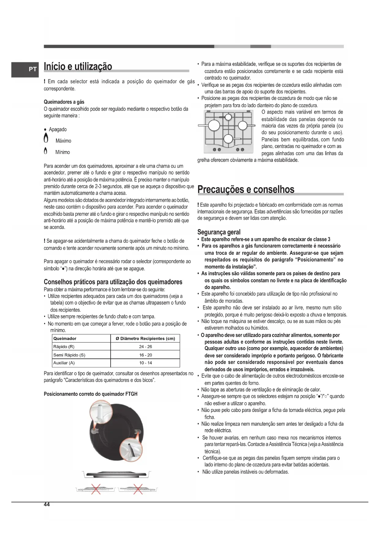 - No momento em que começar a ferver, rode o botão para a posição de mínimo. Rápido (R)Semi Rápido (S)Auxiliar (A)Ø Diâmetro Recipientes (cm)24 - 2616 - 2010 - 14Queimador Para identicar o tipo de queimador, consultar os desenhos apresentados no parágrafo “Características dos queimadores e dos bicos”. Posicionamento correto do queimador FTGH