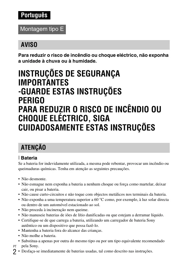 Português Montagem tipo E AVISO Para reduzir o risco de incêndio ou choque eléctrico, não exponha a unidade à chuva ou à humidade.