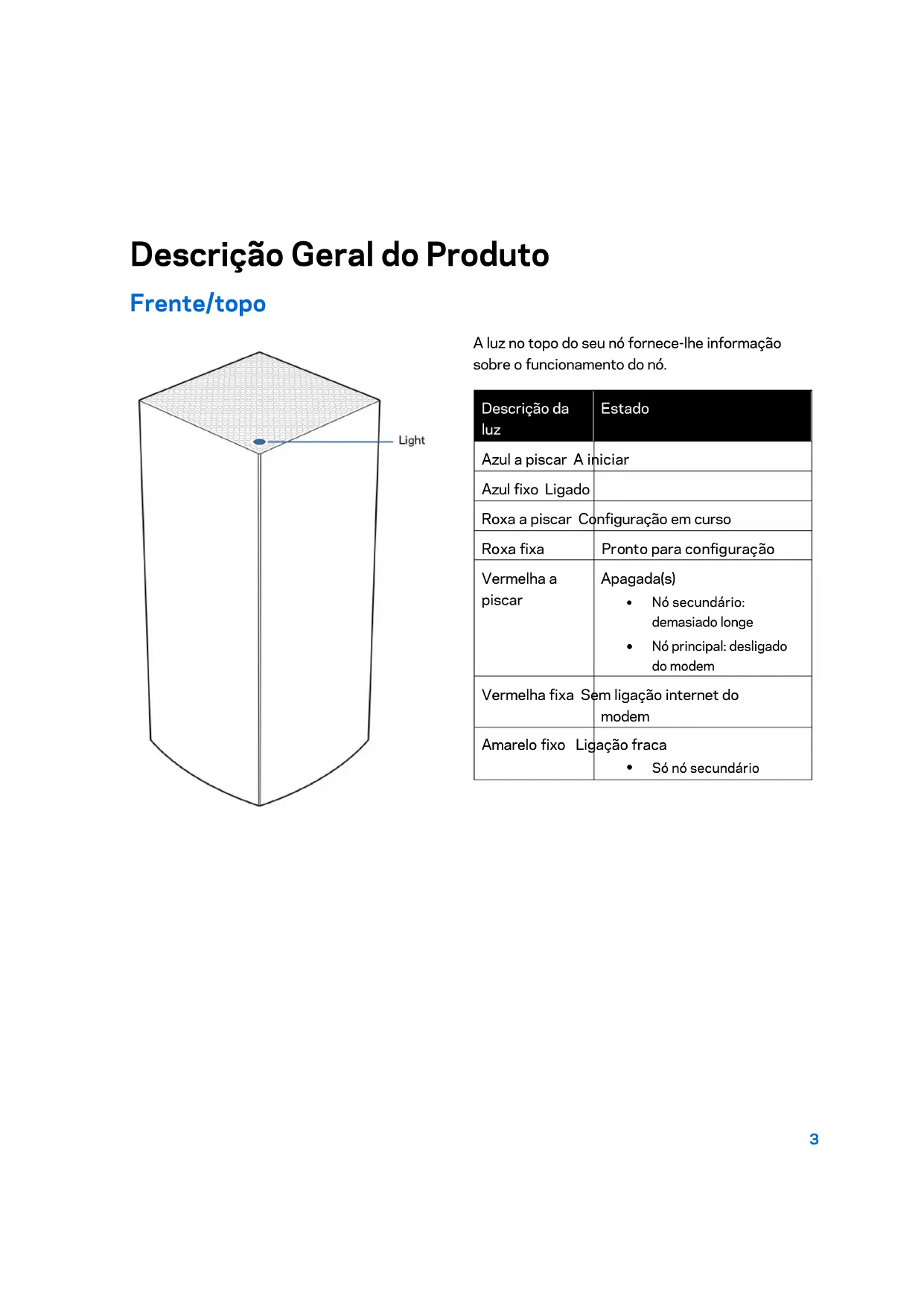 Nó primário: desconectado do modem Vermelho sólido Modem sem internet Amarelo sólido Conexão fraca