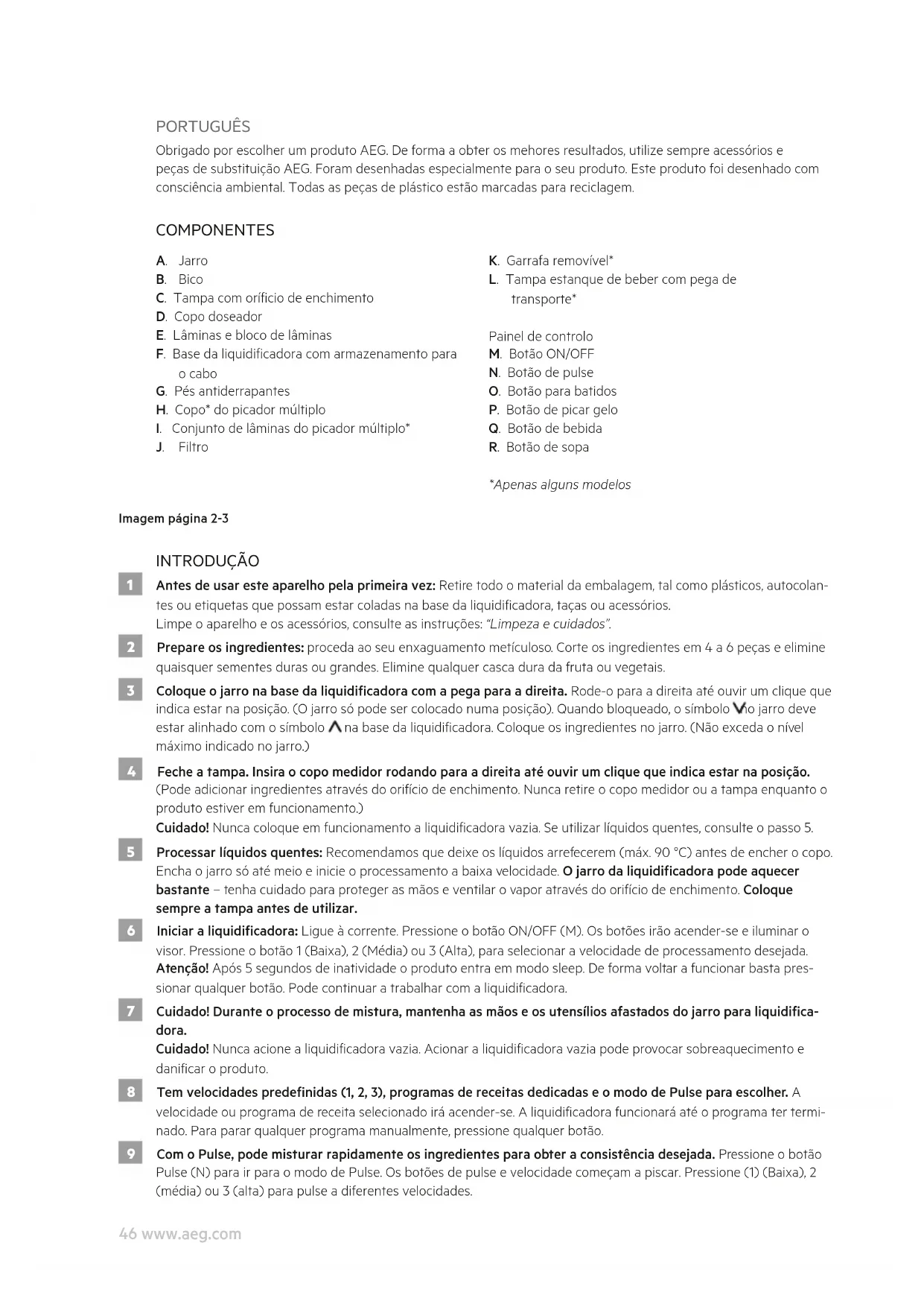 J. Filtro K. Garrafa removível* L. Tampa estanque de beber com pega de transporte* Painel de controlo M. Botão ON/OFF N. Botão de pulse O. Botão para batidos P. Botão de picar gelo Q. Botão de bebida R. Botão de sopa *Apenas alguns modelos Imagem página 2-3 INTRODUÇÃO 1 Antes de usar este aparelho pela primeira vez: Retire todo o material da embalagem, tal como plásticos, autocolan- tes ou etiquetas que possam estar coladas na base da liquidicadora, taças ou acessórios. Limpe o aparelho e os acessórios, consulte as instruções: “Limpeza e cuidados”. 2 Prepare os ingredientes: proceda ao seu enxaguamento metículoso. Corte os ingredientes em 4 a 6 peças e elimine quaisquer sementes duras ou grandes. Elimine qualquer casca dura da fruta ou vegetais. 3 Coloque o jarro na base da liquidicadora com a pega para a direita. Rode-o para a direita até ouvir um clique que indica estar na posição. (O jarro só pode ser colocado numa posição). Quando bloqueado, o símbolo no jarro deve estar alinhado com o símbolo na base da liquidicadora. Coloque os ingredientes no jarro. (Não exceda o nível máximo indicado no jarro.) 4 Feche a tampa. Insira o copo medidor rodando para a direita até ouvir um clique que indica estar na posição. (Pode adicionar ingredientes através do orifício de enchimento. Nunca retire o copo medidor ou a tampa enquanto o produto estiver em funcionamento.) Cuidado! Nunca coloque em funcionamento a liquidicadora vazia. Se utilizar líquidos quentes, consulte o passo 5. 5 Processar líquidos quentes: Recomendamos que deixe os líquidos arrefecerem (máx. 90 °C) antes de encher o copo. Encha o jarro só até meio e inicie o processamento a baixa velocidade. O jarro da liquidicadora pode aquecer bastante – tenha cuidado para proteger as mãos e ventilar o vapor através do orifício de enchimento. Coloque sempre a tampa antes de utilizar. 6 Iniciar a liquidicadora: Ligue à corrente. Pressione o botão ON/OFF (M). Os botões irão acender-se e iluminar o visor. Pressione o botão 1 (Baixa), 2 (Média) ou 3 (Alta), para selecionar a velocidade de processamento desejada. Atenção! Após 5 segundos de inatividade o produto entra em modo sleep. De forma voltar a funcionar basta pres- sionar qualquer botão. Pode continuar a trabalhar com a liquidicadora. 7 Cuidado! Durante o processo de mistura, mantenha as mãos e os utensílios afastados do jarro para liquidica- dora. Cuidado! Nunca acione a liquidicadora vazia. Acionar a liquidicadora vazia pode provocar sobreaquecimento e danicar o produto. 8 Tem velocidades predenidas (1, 2, 3), programas de receitas dedicadas e o modo de Pulse para escolher. A velocidade ou programa de receita selecionado irá acender-se. A liquidicadora funcionará até o programa ter termi- nado. Para parar qualquer programa manualmente, pressione qualquer botão. 9 Com o Pulse, pode misturar rapidamente os ingredientes para obter a consistência desejada. Pressione o botão Pulse (N) para ir para o modo de Pulse. Os botões de pulse e velocidade começam a piscar. Pressione (1) (Baixa), 2 (média) ou 3 (alta) para pulse a diferentes velocidades.47www.aeg.com