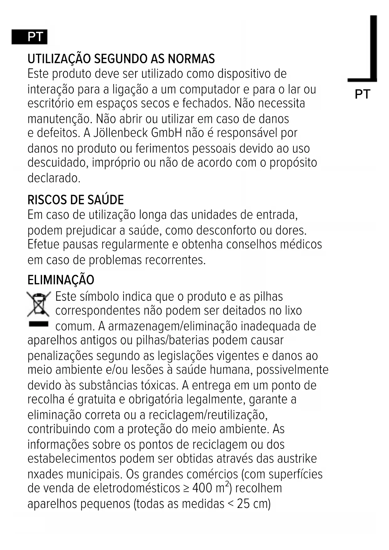 Este produto deve ser utilizado como dispositivo de interação para a ligação a um computador e para o lar ou escritório em espaços secos e fechados. Não necessita manutenção. Não abrir ou utilizar em caso de danos e defeitos. A Jöllenbeck GmbH não é responsável por danos no produto ou ferimentos pessoais devido ao uso descuidado, impróprio ou não de acordo com o propósito declarado.