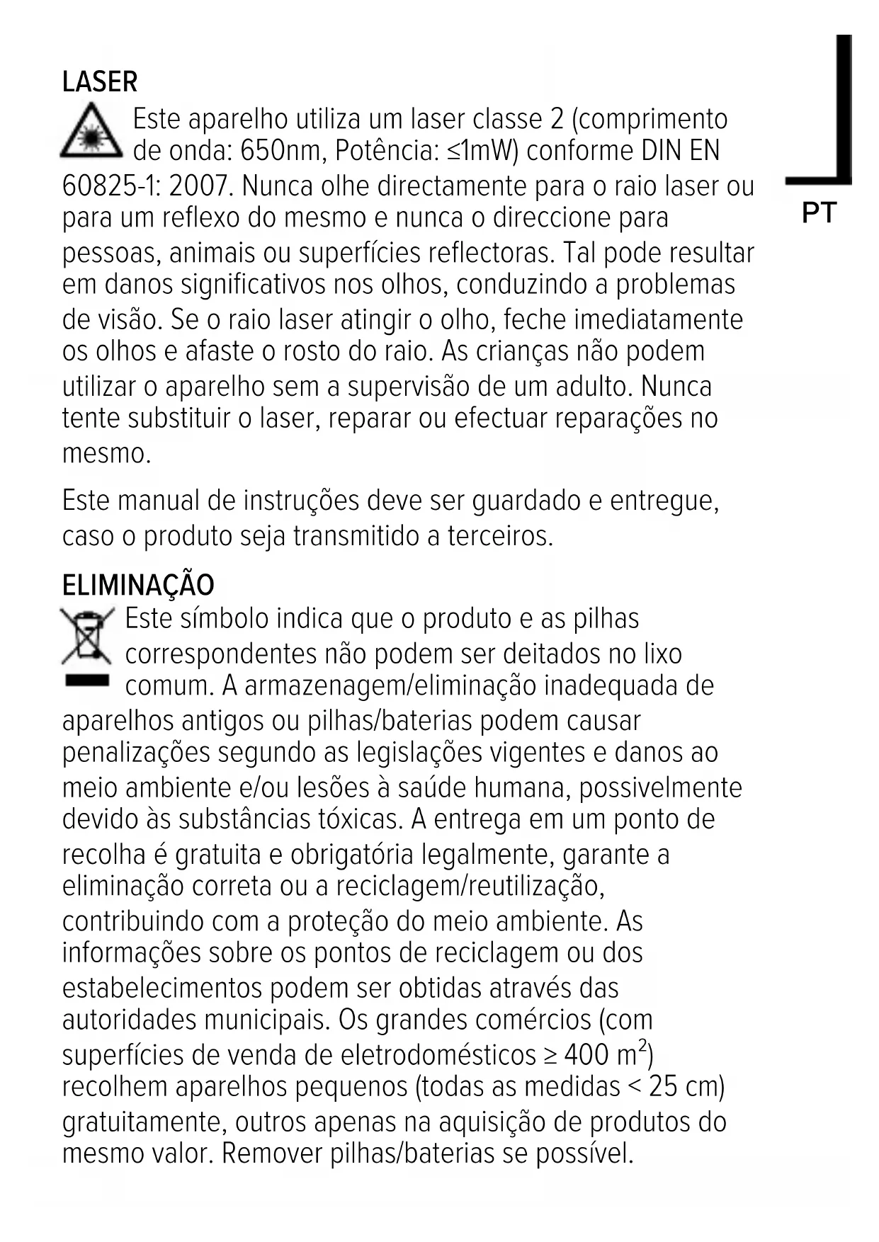 Este produto deve ser utilizado como dispositivo de interação para a ligação a um computador e para o lar ou escritório em espaços secos e fechados. Não necessita manutenção. Não abrir ou utilizar em caso de danos e defeitos. A Jöllenbeck GmbH não é responsável por danos no produto ou ferimentos pessoais devido ao uso descuidado, impróprio ou não de acordo com o propósito declarado.PT LASER Este aparelho utiliza um laser classe 2 (comprimento de onda: 650nm, Potência: ≤1mW) conforme DIN EN 60825-1: 2007. Nunca olhe directamente para o raio laser ou para um reflexo do mesmo e nunca o direccione para pessoas, animais ou superfícies reflectoras. Tal pode resultar em danos significativos nos olhos, conduzindo a problemas de visão. Se o raio laser atingir o olho, feche imediatamente os olhos e afaste o rosto do raio. As crianças não podem utilizar o aparelho sem a supervisão de um adulto. Nunca tente substituir o laser, reparar ou efectuar reparações no mesmo. Este manual de instruções deve ser guardado e entregue, caso o produto seja transmitido a terceiros. ELIMINAÇÃO Este símbolo indica que o produto e as pilhas correspondentes não podem ser deitados no lixo comum. A armazenagem/eliminação inadequada de aparelhos antigos ou pilhas/baterias podem causar penalizações segundo as legislações vigentes e danos ao meio ambiente e/ou lesões à saúde humana, possivelmente devido às substâncias tóxicas. A entrega em um ponto de recolha é gratuita e obrigatória legalmente, garante a eliminação correta ou a reciclagem/reutilização, contribuindo com a proteção do meio ambiente. As informações sobre os pontos de reciclagem ou dos estabelecimentos podem ser obtidas através das autoridades municipais. Os grandes comércios (com superfícies de venda de eletrodomésticos ≥ 400 m²) recolhem aparelhos pequenos (todas as medidas < 25 cm) gratuitamente, outros apenas na aquisição de produtos do mesmo valor. Remover pilhas/baterias se possível.INFORMAÇÃO SOBRE AS PILHAS Este produto utiliza células alcalinas de manganés. Utilizar apenas este tipo de pilha. As pilhas usadas/fracas devem ser substituídas imediatamente, não reutilizar. Guardar as pilhas em lugar seco, fora do alcance das crianças. Não deitar no fogo nem as submeta a altas temperaturas.