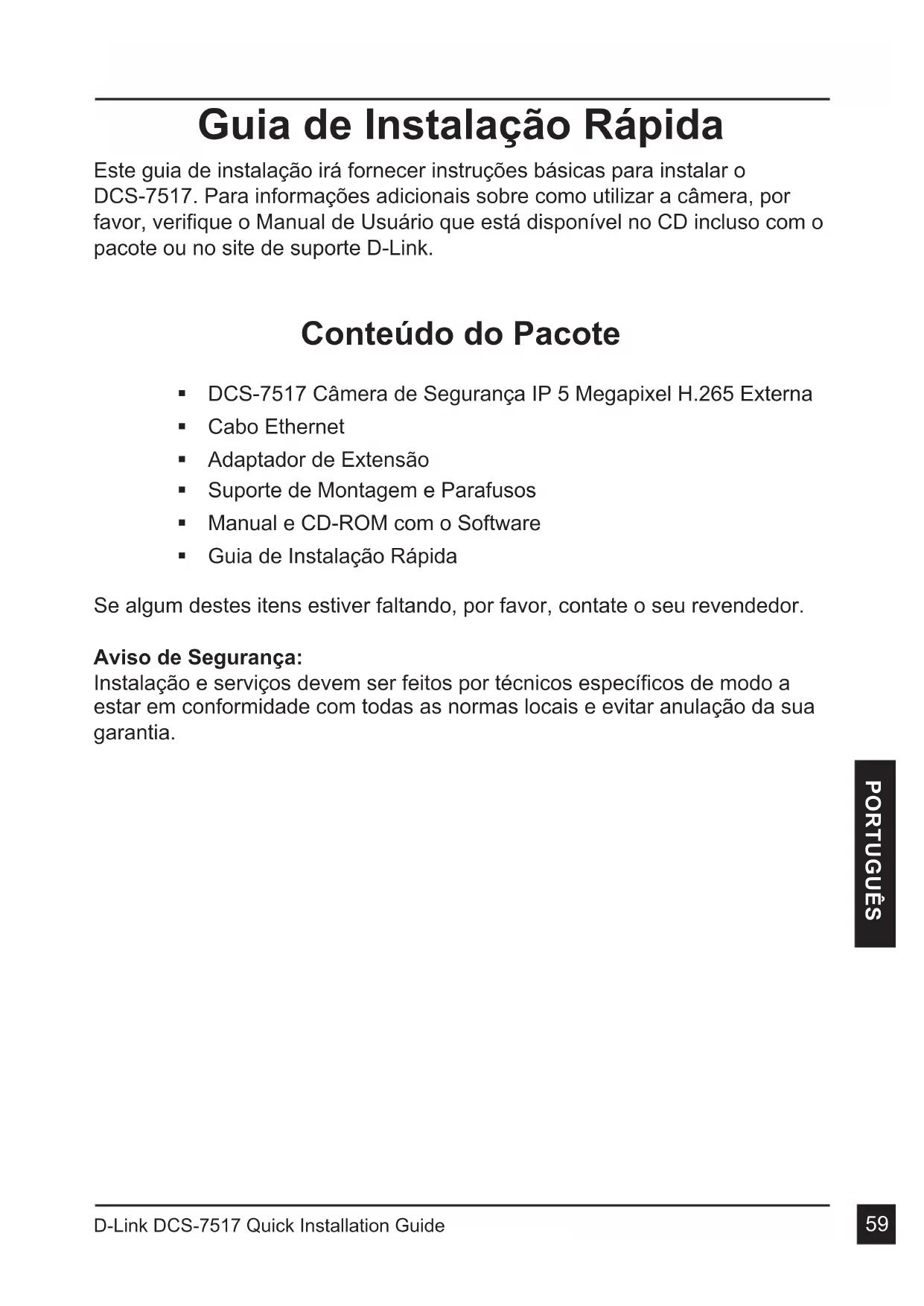 PORTUGUÊS Guia de Instalação Rápida Este guia de instalação irá fornecer instruções básicas para instalar o DCS-7517. Para informações adicionais sobre como utilizar a câmera, por favor, verifique o Manual de Usuário que está disponível no CD incluso com o pacote ou no site de suporte D-Link. Conteúdo do Pacote DCS-7517 Câmera de Segurança IP 5 Megapixel H.265 Externa Cabo Ethernet Adaptador de Extensão Suporte de Montagem e Parafusos Manual e CD-ROM com o Software Guia de Instalação Rápida Se algum destes itens estiver faltando, por favor, contate o seu revendedor. Aviso de Segurança: Instalação e serviços devem ser feitos por técnicos específicos de modo a estar em conformidade com todas as normas locais e evitar anulação da sua garantia.D-Link DCS-7517 Quick Installation Guide