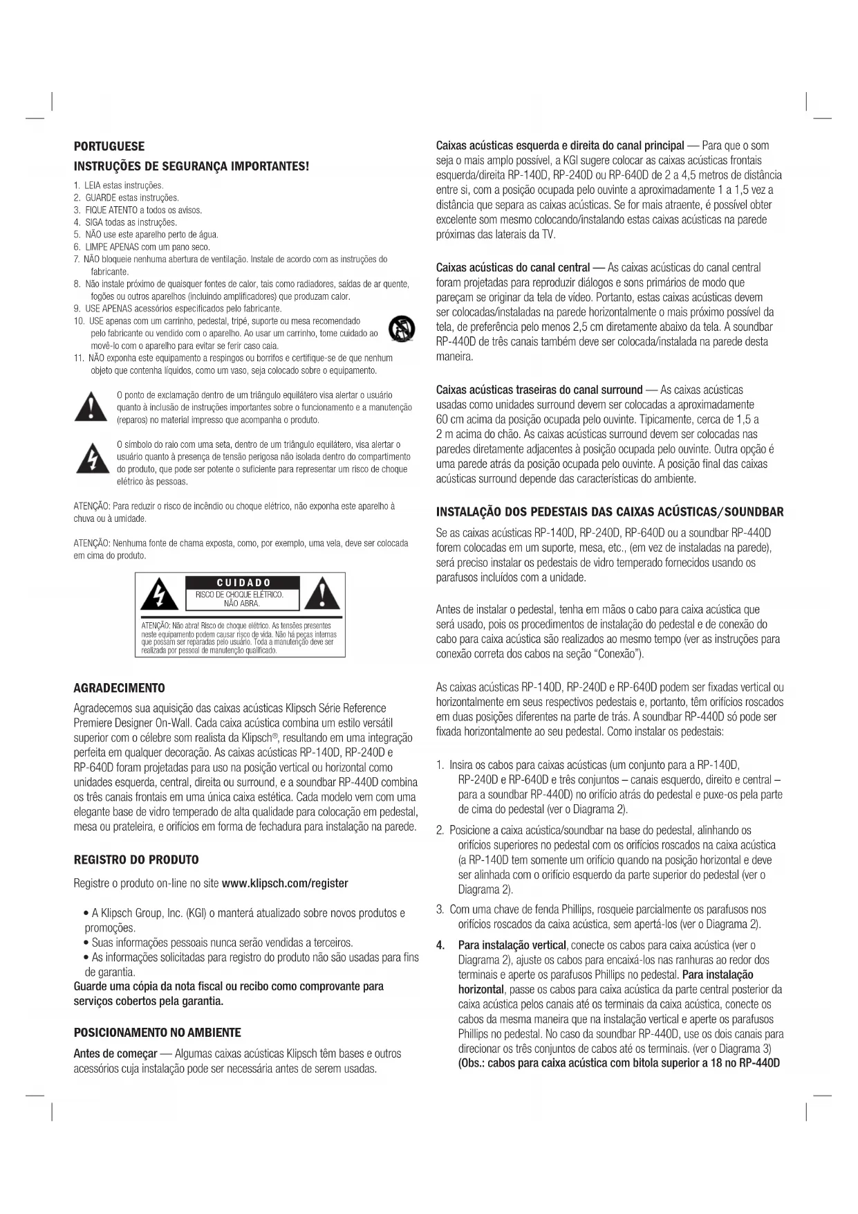 Diagrama 2), ajuste os cabos para encaixá-los nas ranhuras ao redor dos terminais e aperte os parafusos Phillips no pedestal. Para instalação horizontal, passe os cabos para caixa acústica da parte central posterior da caixa acústica pelos canais até os terminais da caixa acústica, conecte os cabos da mesma maneira que na instalação vertical e aperte os parafusos Phillips no pedestal. No caso da soundbar RP-440D, use os dois canais para direcionar os três conjuntos de cabos até os terminais. (ver o Diagrama 3) (Obs.: cabos para caixa acústica com bitola superior a 18 no RP-440D CUIDADO ATENÇÃO: Não abra! Risco de choque elétrico. As tensões presentes neste equipamento podem causar risco de vida. Não há peças internas que possam ser reparadas pelo usuário. Toda a manutenção deve ser realizada por pessoal de manutenção qualificado. RISCO DE CHOQUE ELÉTRICO. NÃO ABRA.podem não caber completamente nos canais). Se necessário, use a tira adesiva fornecida para manter o excesso de cabo no lugar. Para alterar a direção logo Klipsch na frente falante retire delicadamente um dos lados e girar 45 ˚. INSTALAÇÃO DAS CAIXAS ACÚSTICAS/SOUNDBAR NA PAREDE Não instale os pedestais se for instalar as caixas acústicas RP-140D, RP-240D, RP-640D ou a soundbar RP-440D na parede. Escolha uma posição adequada para instalar cada caixa acústica na parede e faça todas as ligações dos cabos em todas as posições das caixas acústicas antes de instalá-las na parede. Não instale no teto.