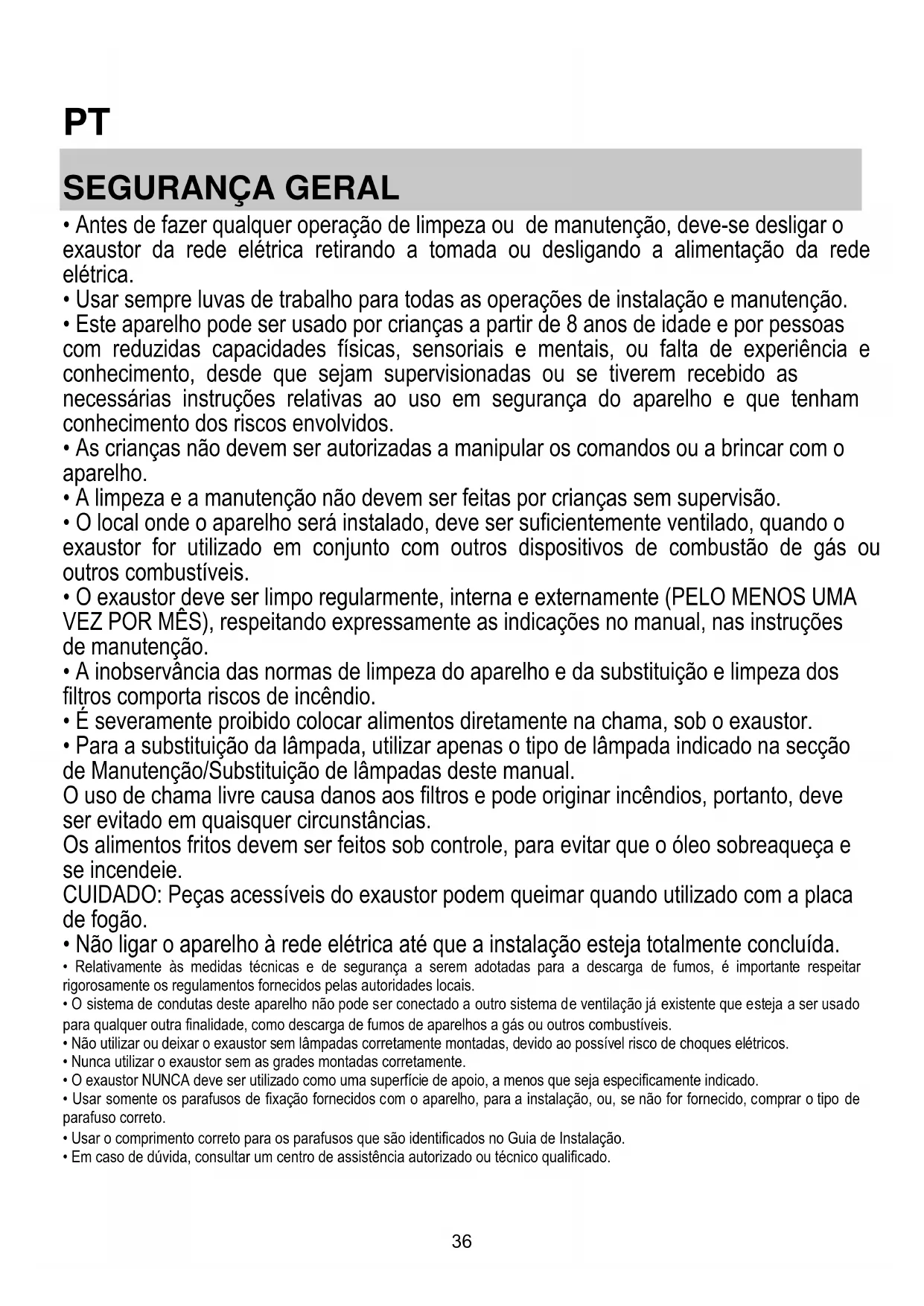 - O exaustor deve ser limpo regularmente, interna e externamente (PELO MENOS UMA VEZ POR MÊS), respeitando expressamente as indicações no manual, nas instruções de manutenção.