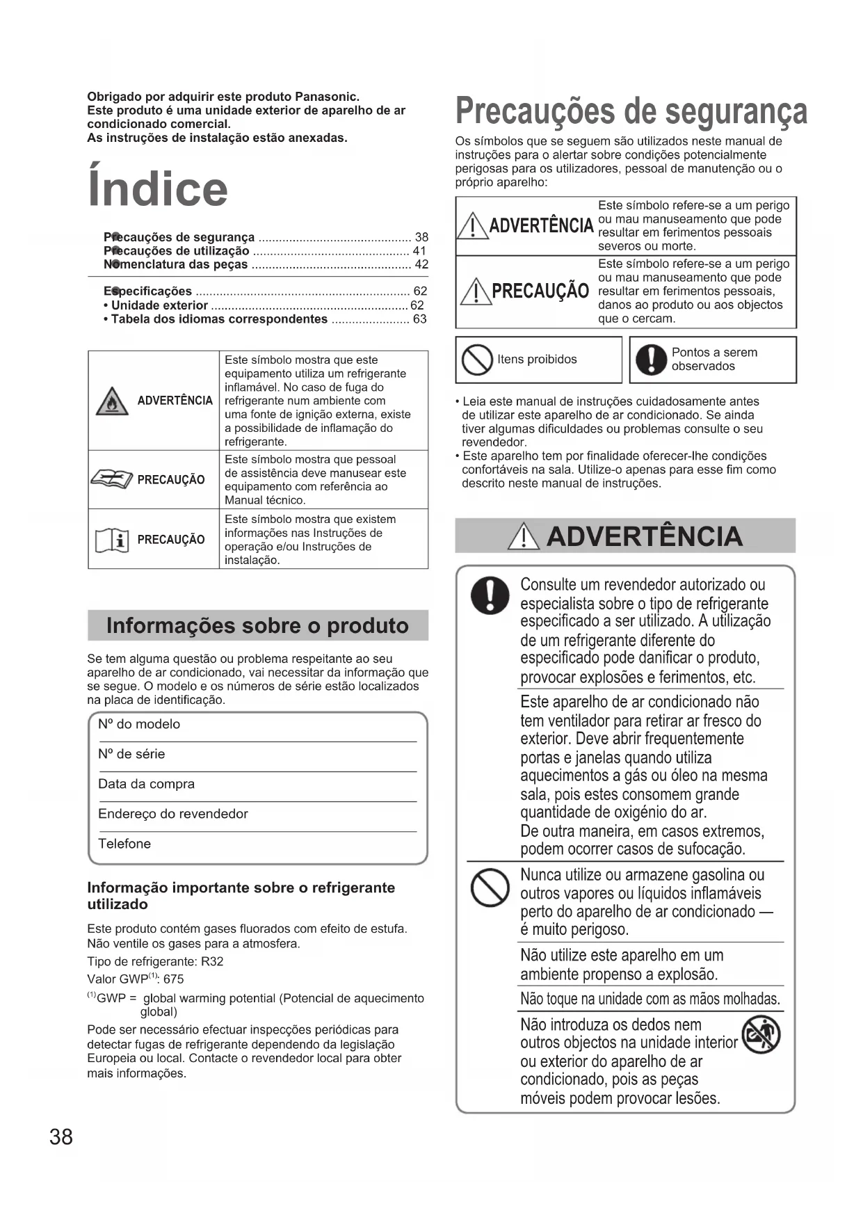 - Tabela dos idiomas correspondentes ....................... 63 Índice Precauções de segurança Informações sobre o produto Se tem alguma questão ou problema respeitante ao seu aparelho de ar condicionado, vai necessitar da informação que se segue. O modelo e os números de série estão localizados na placa de identicação.Nº do modelo Nº de série Data da compraEndereço do revendedorTelefoneConsulte um revendedor autorizado ou especialista sobre o tipo de refrigerante especicado a ser utilizado. A utilização de um refrigerante diferente do especicado pode danicar o produto, provocar explosões e ferimentos, etc.Este aparelho de ar condicionado não tem ventilador para retirar ar fresco do exterior. Deve abrir frequentemente portas e janelas quando utiliza aquecimentos a gás ou óleo na mesma sala, pois estes consomem grande quantidade de oxigénio do ar. De outra maneira, em casos extremos, podem ocorrer casos de sufocação.Nunca utilize ou armazene gasolina ou outros vapores ou líquidos inamáveis perto do aparelho de ar condicionado — é muito perigoso.Não utilize este aparelho em um ambiente propenso a explosão.Não toque na unidade com as mãos molhadas.Não introduza os dedos nem outros objectos na unidade interior ou exterior do aparelho de ar condicionado, pois as peças móveis podem provocar lesões.Os símbolos que se seguem são utilizados neste manual de instruções para o alertar sobre condições potencialmente perigosas para os utilizadores, pessoal de manutenção ou o próprio aparelho: ADVERTÊNCIA Este símbolo refere-se a um perigo ou mau manuseamento que pode resultar em ferimentos pessoais severos ou morte. PRECAUÇÃO Este símbolo refere-se a um perigo ou mau manuseamento que pode resultar em ferimentos pessoais, danos ao produto ou aos objectos que o cercam.Itens proibidosPontos a serem observados• Leia este manual de instruções cuidadosamente antes de utilizar este aparelho de ar condicionado. Se ainda tiver algumas diculdades ou problemas consulte o seu revendedor.• Este aparelho tem por nalidade oferecer-lhe condições confortáveis na sala. Utilize-o apenas para esse m como descrito neste manual de instruções. ADVERTÊNCIA Obrigado por adquirir este produto Panasonic.Este produto é uma unidade exterior de aparelho de ar condicionado comercial.As instruções de instalação estão anexadas.ADVERTÊNCIAEste símbolo mostra que este equipamento utiliza um refrigerante inamável. No caso de fuga do refrigerante num ambiente com uma fonte de ignição externa, existe a possibilidade de inamação do refrigerante.PRECAUÇÃOEste símbolo mostra que pessoal de assistência deve manusear este equipamento com referência ao Manual técnico.PRECAUÇÃOEste símbolo mostra que existem informações nas Instruções de operação e/ou Instruções de instalação.Informação importante sobre o refrigerante utilizadoEste produto contém gases uorados com efeito de estufa. Não ventile os gases para a atmosfera.Tipo de refrigerante: R32Valor GWP (1) : 675 (1) GWP = global warming potential (Potencial de aquecimento global)Pode ser necessário efectuar inspecções periódicas para detectar fugas de refrigerante dependendo da legislação Europeia ou local. Contacte o revendedor local para obter mais informações. OI_00_302355_all.indb 38 2018/9/20 10:01:4039 PORTUGUÊS ADVERTÊNCIA Se o refrigerante entrar em contacto com uma chama, ele produzirá um gás tóxico. Por razões de segurança, certique- se de que desliga o aparelho de ar condicionado e a corrente eléctrica antes da limpeza ou da assistência. Em caso de emergência, desligue a cha eléctrica da tomada ou desligue o disjuntor ou o interruptor eléctrico para isolar o aparelho de ar condicionado da fonte de alimentação. Elimine de acordo com a legislação nacional e/ou local. Este produto não deve ser modicado ou desmontado em nenhuma hipótese. Uma unidade desmontada ou modicada pode causar incêndio, choque eléctrico ou ferimento. Os utilizadores não devem limpar o interior das unidades exteriores e interiores. A limpeza deve ser realizada por um especialista ou um revendedor autorizado. Em caso de avaria deste aparelho, não o repare sozinho. Entre em contacto com o distribuidor ou o representante de assistência para efectuar uma reparação e eliminação. De modo a evitar o sobreaquecimento e incêndios, não utilize cabos modicados, cabos partilhados, extensões eléctricas nem cabos não especicados. Providencie uma tomada eléctrica para ser utilizada exclusivamente para cada unidade, bem como um interruptor para a fonte de energia, um disjuntor de fugas de ligação à terra (ELCB) ou um dispositivo de corrente residual (RCD) para protecção de sobrecorrente na linha exclusiva. Providencie uma tomada eléctrica exclusivamente para cada unidade e integrar meios de desactivação total com separação de contacto em todos os pólos da instalação eléctrica xa, conforme as normas de ação. Para impedir possíveis perigos devido a falha do isolamento, tem de ligar a unidade à massa. O aparelho deve ser armazenado em uma sala sem fontes de ignição em funcionamento contínuo (por exemplo: chamas abertas, aparelho de gás em funcionamento ou um aquecedor eléctrico em funcionamento). Tenha em mente que os refrigerantes podem ser inodoros. Uma área sem ventilação, na qual seja instalado um aparelho que utilize refrigerantes inamáveis, deve ser construída de forma que qualquer fuga do refrigerante não que connada no ambiente, pois isso criaria um perigo de incêndio ou explosão. O aparelho deverá ser armazenado em uma área bem ventilada em que o tamanho da sala corresponda à área da sala conforme especicado para o funcionamento. Depois de instalar a unidade, certique- se de que pergunta ao instalador sobre o espaço do piso da sala onde a unidade está instalada e sobre a quantidade de carga do refrigerante. No caso de mudança da unidade ou de um d