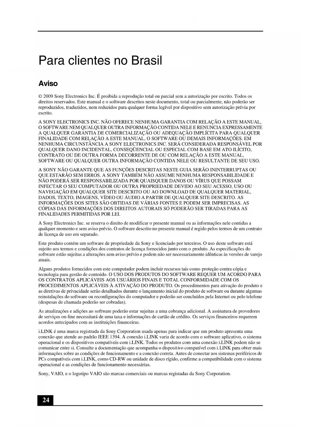 λ23 Cuidado de la pantalla LCD ❑ La exposición directa a los rayos del sol puede dañar la pantalla LCD. Tenga cuidado cuando utilice la computadora cerca de una ventana. ❑ No raye la pantalla LCD ni ejerza presión sobre ella ya que esto podría provocar un funcionamiento defectuoso. ❑ El uso de la computadora a bajos niveles de temperatura puede producir una imagen residual en la pantalla. Esto no implica un funcionamiento defectuoso. Cuando la computadora vuelva a temperatura normal, la pantalla funcionará normalmente. ❑ La suba de temperatura de la pantalla durante su funcionamiento es normal y no indica anomalía ni defecto en el equipo. ❑ La pantalla LCD ha sido fabricado utilizando tecnología de alta precisión. Sin embargo, podrían aparecer continuamente unos diminutos puntos negros o puntos brillantes (rojos, azules o verdes) en la pantalla LCD. Esto es el resultado normal del proceso de fabricación y no indica una anomalía. Para cambiar la batería de reserva, póngase en contacto con el Centro de servicio Sony más cercano. Con IEEE 802.11a (5 GHz), utilice la red local inalámbrica solamente en interiores. No manipule baterías de iones de litio dañadas o con pérdidas. Si la batería se reemplaza de forma incorrecta, se corre peligro de que ocurra una explosión. Reemplácela solamente por una del mismo tipo o equivalente recomendado por el fabricante. Deseche las baterías usadas según las instrucciones del fabricante. La batería utilizada en este dispositivo puede presentar peligros de incendio o quemaduras químicas si se la manipula de forma incorrecta. No se debe desarmar, calentar sobre los 60°C / 140°F ni incinerar. Deseche la batería usada rápidamente. Manténgala fuera del alcance de los niños. No provoque un cortocircuito.24 Para clientes no Brasil Aviso © 2009 Sony Electronics Inc. É proibida a reprodução total ou parcial sem a autorização por escrito. Todos os direitos reservados. Este manual e o software descritos neste documento, total ou parcialmente, não poderão ser reproduzidos, traduzidos, nem reduzidos para qualquer forma legível por dispositivo sem autorização prévia por escrito. A SONY ELECTRONICS INC. NÃO OFERECE NENHUMA GARANTIA COM RELAÇÃO A ESTE MANUAL, O SOFTWARE NEM QUALQUER OUTRA INFORMAÇÃO CONTIDA NELE E RENUNCIA EXPRESSAMENTE A QUALQUER GARANTIA DE COMERCIALIZAÇÃO OU ADEQUAÇÃO IMPLÍCITA PARA QUALQUER FINALIDADE COM RELAÇÃO A ESTE MANUAL, O SOFTWARE OU DEMAIS INFORMAÇÕES. EM NENHUMA CIRCUNSTÂNCIA A SONY ELECTRONICS INC. SERÁ CONSIDERADA RESPONSÁVEL POR QUALQUER DANO INCIDENTAL, CONSEQÜENCIAL OU ESPECIAL COM BASE EM ATO ILÍCITO, CONTRATO OU DE OUTRA FORMA DECORRENTE DE OU COM RELAÇÃO A ESTE MANUAL, SOFTWARE OU QUALQUER OUTRA INFORMAÇÃO CONTIDA NELE OU RESULTANTE DE SEU USO. A SONY NÃO GARANTE QUE AS FUNÇÕES DESCRITAS NESTE GUIA SERÃO ININTERRUPTAS OU QUE ESTARÃO SEM ERROS. A SONY TAMBÉM NÃO ASSUME NENHUMA RESPONSABILIDADE E NÃO PODERÁ SER RESPONSABILIZADA POR QUAISQUER DANOS OU VÍRUS QUE POSSAM INFECTAR O SEU COMPUTADOR OU OUTRA PROPRIEDADE DEVIDO AO SEU ACESSO, USO OU NAVEGAÇÃO EM QUALQUER SITE DESCRITO OU AO DOWNLOAD DE QUALQUER MATERIAL, DADOS, TEXTO, IMAGENS, VÍDEO OU ÁUDIO A PARTIR DE QUALQUER SITE DESCRITO. AS INFORMAÇÕES DOS SITES SÃO OBTIDAS DE VÁRIAS FONTES E PODEM SER IMPRECISAS. AS CÓPIAS DAS INFORMAÇÕES DOS DIREITOS AUTORAIS SÓ PODERÃO SER TIRADAS PARA AS FINALIDADES PERMITIDAS POR LEI. A Sony Electronics Inc. se reserva o direito de modificar o presente manual ou as informações nele contidas a qualquer momento e sem aviso prévio. O software descrito no presente manual é regido pelos termos de um contrato de licença de uso em separado. Este produto contém um software de propriedade da Sony e licenciado por terceiros. O uso deste software está sujeito aos termos e condições dos contratos de licença fornecidos junto com o produto. As especificações do software estão sujeitas a alterações sem aviso prévio e podem não ser necessariamente idênticas às versões de varejo atuais. Alguns produtos fornecidos com este computador podem incluir recursos tais como proteção contra cópia e tecnologia para gestão de conteúdo. O USO DOS PRODUTOS DO SOFTWARE REQUER UM ACORDO PARA OS CONTRATOS APLICÁVEIS AOS USUÁRIOS FINAIS E TOTAL CONFORMIDADE COM OS PROCEDIMENTOS APLICÁVEIS À ATIVAÇÃO DO PRODUTO. Os procedimentos para ativação do produto e as diretivas de privacidade serão detalhados durante o lançamento inicial do produto de software ou durante algumas reinstalações do software ou reconfigurações do computador e poderão ser concluídos pela Internet ou pelo telefone (despesas de chamada poderão ser cobradas). As atualizações e adições ao software poderão estar sujeitas a uma cobrança adicional. A assinatura de provedores de serviços on-line necessitará de uma taxa e informações de cartão de crédito. Os serviços financeiros requerem acordos antecipados com as instituições financeiras. i.LINK é uma marca registrada da Sony Corporation usada apenas para indicar que um produto apresenta uma conexão que atende ao padrão IEEE 1394. A conexão i.LINK varia de acordo com o software aplicativo, o sistema operacional e os dispositivos compatíveis com i.LINK. Todos os produtos com uma conexão i.LINK podem não se comunicar entre si. Consulte a documentação que acompanha o dispositivo compatível com i.LINK para obter mais informações sobre as condições de funcionamento e a conexão correta. Antes de conectar aos sistemas periféricos de PCs compatíveis com i.LINK, como CD-RW ou unidade de disco rígido, confirme a compatibilidade com o sistema operacional e as condições de funcionamento necessárias. Sony, VAIO, e o logotipo VAIO são marcas comerciais ou marcas registadas da Sony Corporation.25 Todas as demais marcas são marcas comerciais ou registradas de seus respectivos proprietários. A engenharia invertida