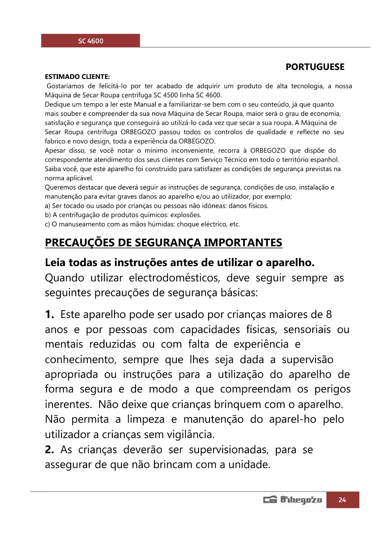 PORTUGUESE ESTIMADO CLIENTE: Gostaríamos de felicitá-lo por ter acabado de adquirir um produto de alta tecnologia, a nossa Máquina de Secar Roupa centrífuga SC 4500 linha SC 4600. Dedique um tempo a ler este Manual e a familiarizar-se bem com o seu conteúdo, já que quanto mais souber e compreender da sua nova Máquina de Secar Roupa, maior será o grau de economia, satisfação e segurança que conseguirá ao utilizá-lo cada vez que secar a sua roupa. A Máquina de Secar Roupa centrífuga ORBEGOZO passou todos os controlos de qualidade e reflecte no seu fabrico e novo design, toda a experiência da ORBEGOZO. Apesar disso, se você notar o mínimo inconveniente, recorra à ORBEGOZO que dispõe do correspondente atendimento dos seus clientes com Serviço Técnico em todo o território espanhol. Saiba você, que este aparelho foi construído para satisfazer as condições de segurança previstas na norma aplicável. Queremos destacar que deverá seguir as instruções de segurança, condições de uso, instalação e manutenção para evitar graves danos ao aparelho e/ou ao utilizador, por exemplo: a) Ser tocado ou usado por crianças ou pessoas não idóneas: danos físicos. b) A centrifugação de produtos químicos: explosões. c) O manuseamento com as mãos húmidas: choque eléctrico, etc.