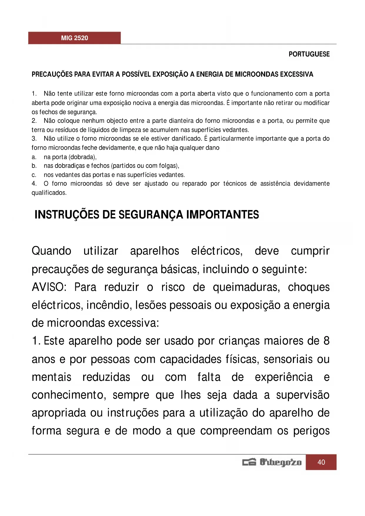 MIG 2520 - Micro-ondas Orbegozo - Manual de utilização gratuito