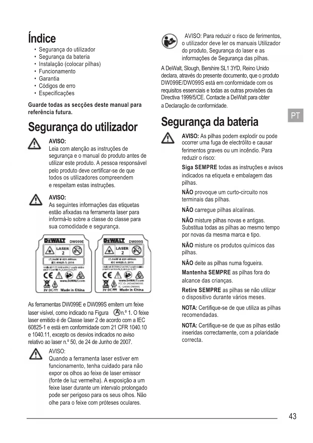 n.º 1. O feixe laser emitido é de Classe laser 2 de acordo com a IEC 60825-1 e está em conformidade com 21 CFR 1040.10 e 1040.11, excepto os desvios indicados no aviso relativo ao laser n.º 50, de 24 de Junho de 2007. AVISO: Quando a ferramenta laser estiver em funcionamento, tenha cuidado para não expor os olhos ao feixe de laser emissor (fonte de luz vermelha). A exposição a um feixe laser durante um intervalo prolongado pode ser perigoso para os seus olhos. Não olhe para o feixe com próteses oculares. AVISO: Para reduzir o risco de ferimentos, o utilizador deve ler os manuais Utilizador do produto, Segurança do laser e as informações de Segurança das pilhas. A DeWalt, Slough, Bershire SL1 3YD, Reino Unido declara, através do presente documento, que o produto DW099E/DW099S está em conformidade com os requisitos essenciais e todas as outras provisões da Directiva 1999/5/CE. Contacte a DeWalt para obter a Declaração de conformidade. Segurança da bateria AVISO: As pilhas podem explodir ou pode ocorrer uma fuga de electrólito e causar ferimentos graves ou um incêndio. Para reduzir o risco: Siga SEMPRE todas as instruções e avisos indicados na etiqueta e embalagem das pilhas. NÃO provoque um curto-circuito nos terminais das pilhas. NÃO carregue pilhas alcalinas. NÃO misture pilhas novas e antigas. Substitua todas as pilhas ao mesmo tempo por novas da mesma marca e tipo. NÃO misture os produtos químicos das pilhas. NÃO deite as pilhas numa fogueira. Mantenha SEMPRE as pilhas fora do alcance das crianças. Retire SEMPRE as pilhas se não utilizar o dispositivo durante vários meses. NOTA: Certique-se de que utiliza as pilhas recomendadas. NOTA: Certique-se de que as pilhas estão inseridas correctamente, com a polaridade correcta.PT