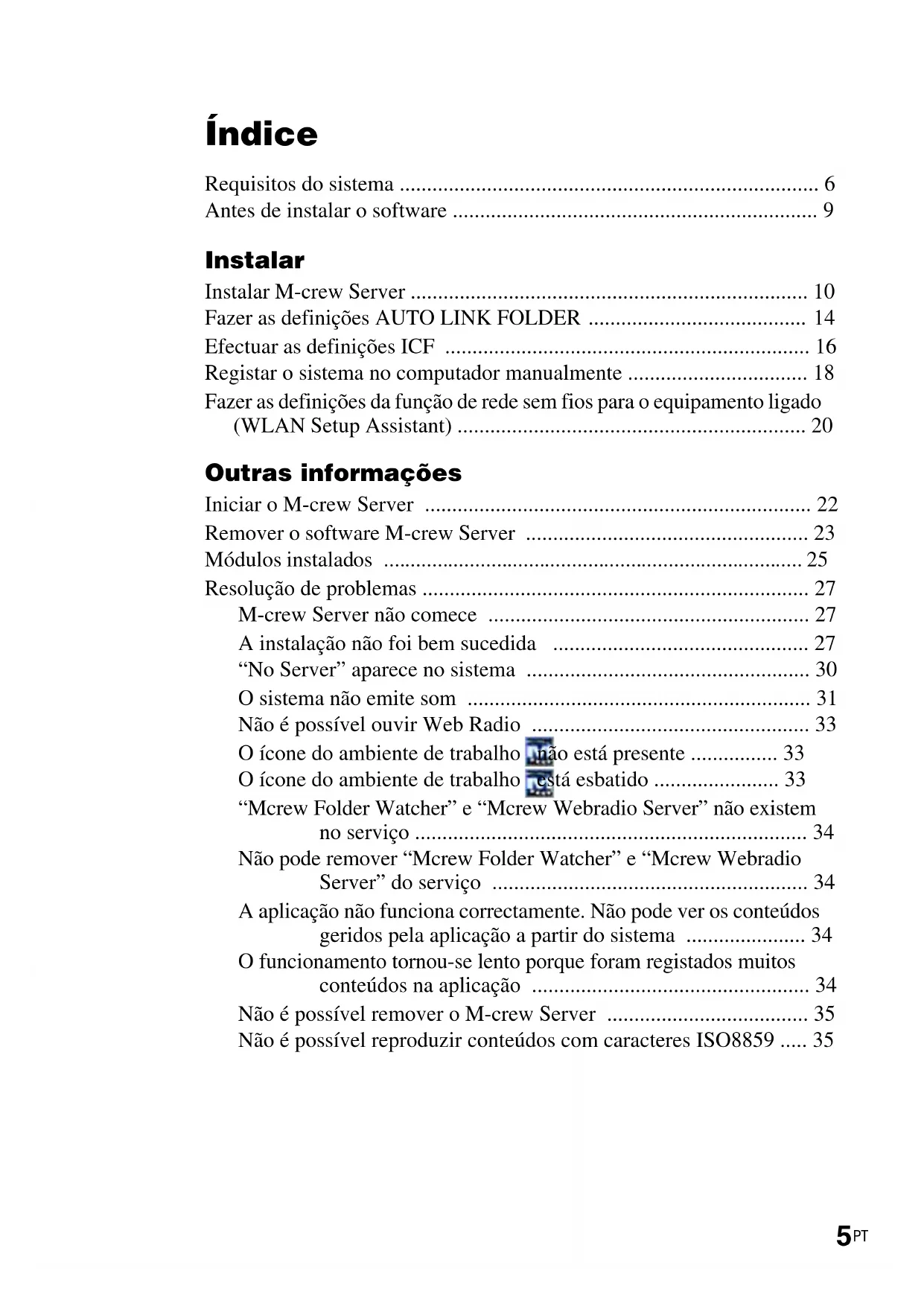 Se ocorrer algo problema durante a instalacao ou remoção do Mcrew Server, utilize a resolution de problemas segunte para solucionar o problema. Se o problema persistiridepresse verificar todos os itens abaixo, consulta o revendedor da Sony mais proximo.