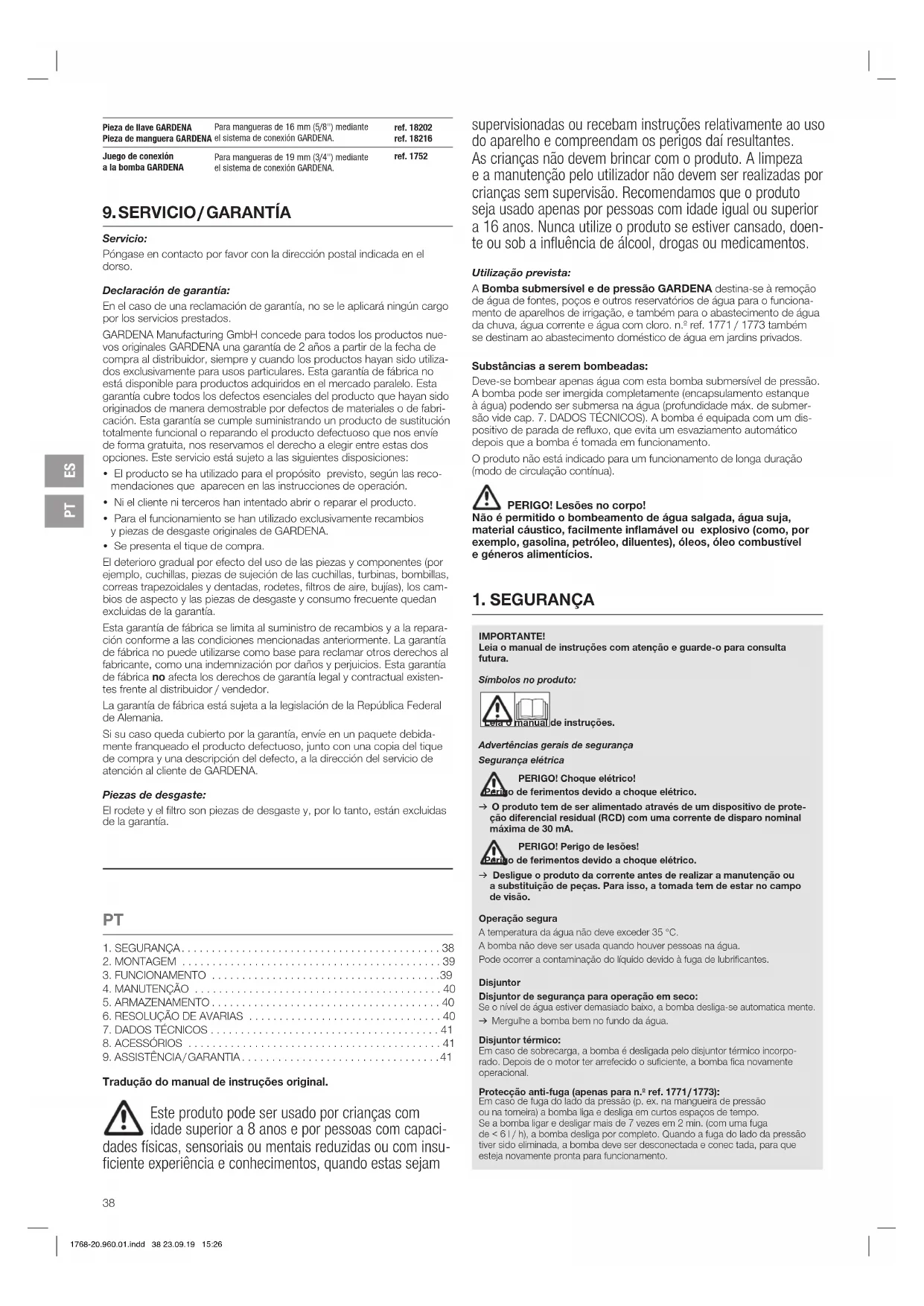 PERIGO! Choque elétrico! Uma ficha de rede cortada implica que umidade possa penetrar na área eléctrica, o que provoca um curto-circuito. v Nunca cortar a ficha de rede (p.ex. com a intenção de passar por uma parede). v Ao desligar puxe pela ficha não pelo cabo da corrente eléctrica. v Se o cabo de alimentação deste aparelho estiver danificado, deverá ser subs- tituído pelo fabricante, pelo seu serviço de assistência ao cliente ou por uma pessoa com qualificações semelhantes, de forma a evitar riscos. Fichas e ligações têm que ser a prova de respingamentos. Certifique-se de as conexões eléctricas estão livres de perigo de alagamento. A ficha e o cabo de ligação devem ser protegidos contra calor, óleo e objectos e esquinas cortantes e/ou pontiagudas. Respeite a Voltagem nominal. Os dados da placa de características têm que estar de acordo com os dados da rede. Certifique-se que a ficha está desligada antes de qualquer utilização da piscina. O cabo de ligação não deve ser usado para fixação ou transporte da bomba. Parta submergir ou içar/segurar a bomba use a corda. Verifique regularmente a ligação à rede. Antes de se utilizar a bomba, deve ser realizada sempre uma inspecção visual (principalmente do cabo de ligação e da ficha). Uma bomba danificada não deve ser utilizada. Em caso de danos, deixar impres- cindivelmente a bomba ser verificada pela assistência técnica da GARDENA. Não desmonte a bomba para além do estado em que foi entregue. Antes da utilização após a manutenção, certifique-se de que todas as peças estão aparafusadas. Se as nossas bombas forem usadas com um gerador, respeite as advertências do fabricante do gerador. Segurança pessoal PERIGO! Risco de asfixia! As peças mais pequenas podem ser engolidas. O saco de plástico repre- senta um risco de asfixia para crianças. Mantenha as crianças afastadas durante a montagem. Observe se o nível mínimo de água está de acordo com as características da bomba. Apenas para n.º ref. 1768: Não deixar a bomba funcionar com a saída fechada por mais de 10 minutos. Areias e outros materiais abrasivos no líquido aumentam o desgaste da bomba e reduzem a sua capacidade de escoamento. A bomba não deve ser usada para a intensificação da pressão mediante a rosca presente do lado de entrada. Na rosca do lado de entrada apenas deve ser montada a sucção flutuante GARDENA. O interruptor flutuante apenas deve ser usado fora de água. A mangueira não deve ser retirada durante a operação. Deixe a bomba arrefecer antes de eliminar a avaria.