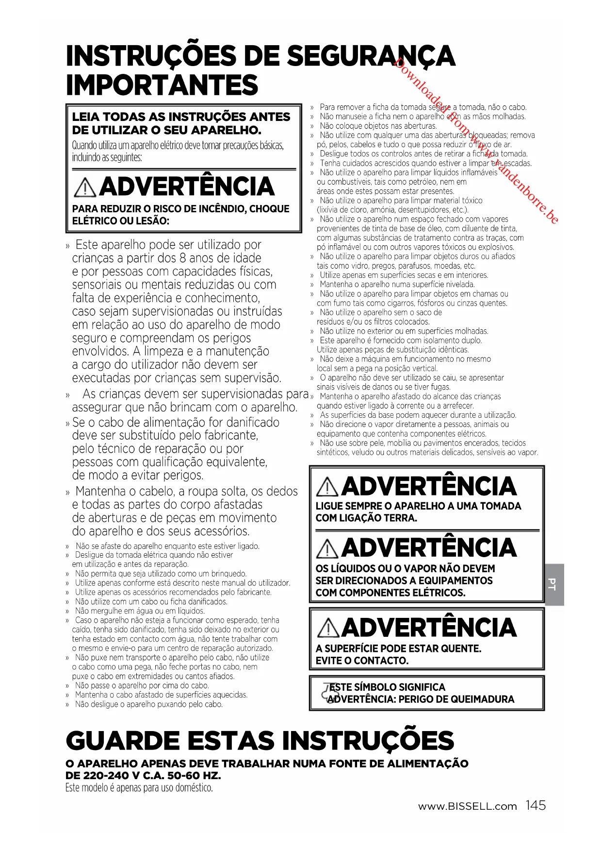 O APARELHO APENAS DEVE TRABALHAR NUMA FONTE DE ALIMENTAÇÃO DE 220-240 V C.A. 50-60 HZ. Este modelo é apenas para uso doméstico. Downloaded from www.vandenborre.bePT www.BISSELL.com