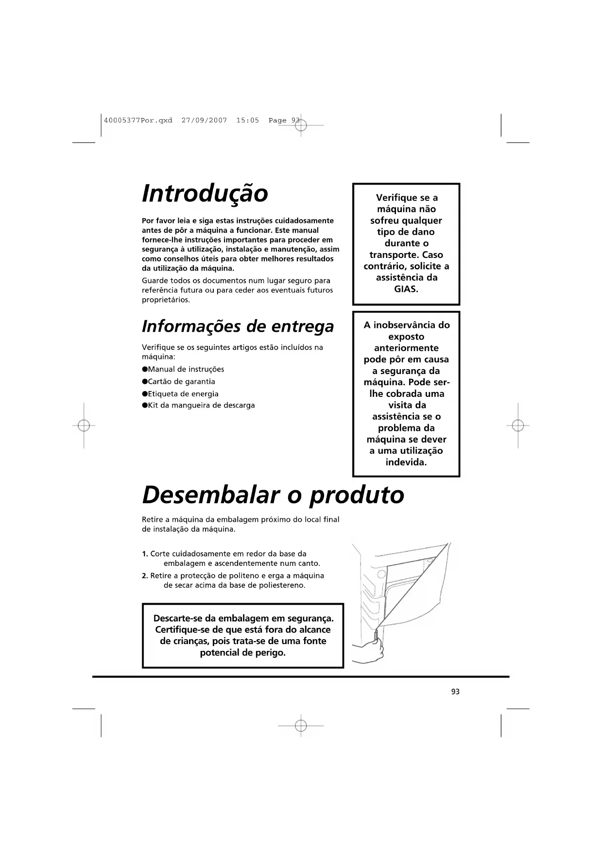 40005377Por.qxd 27/09/2007 15:19 Page 92Introdução Por favor leia e siga estas instruções cuidadosamente antes de pôr a máquina a funcionar. Este manual fornece-lhe instruções importantes para proceder em segurança à utilização, instalação e manutenção, assim como conselhos úteis para obter melhores resultados da utilização da máquina. Guarde todos os documentos num lugar seguro para referência futura ou para ceder aos eventuais futuros proprietários. Informações de entrega Verifique se os seguintes artigos estão incluídos na máquina: ● Manual de instruções ● Cartão de garantia ● Etiqueta de energia ● Kit da mangueira de descarga Retire a máquina da embalagem próximo do local final de instalação da máquina.